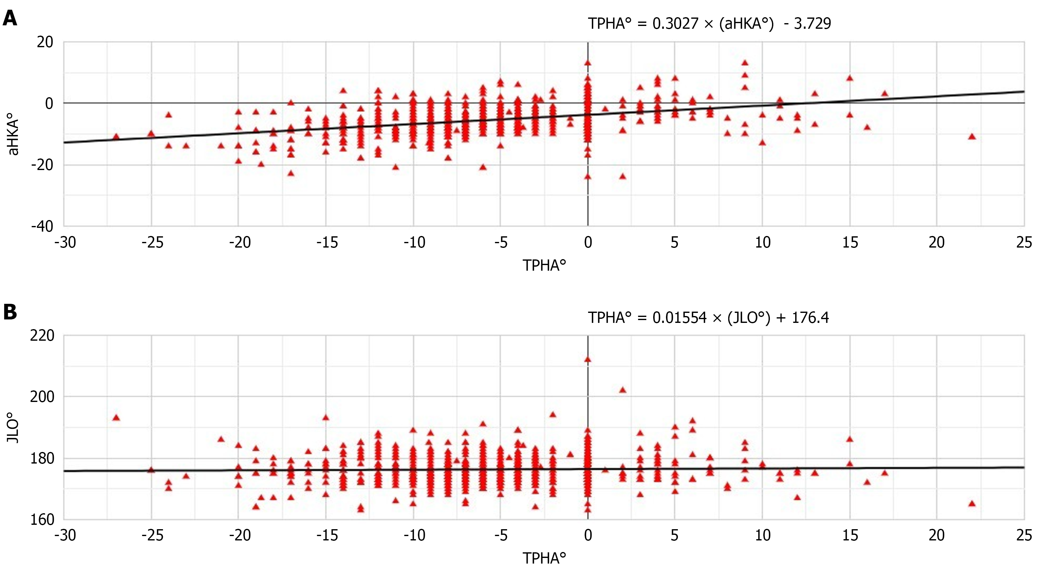 A: The arithmetic hip, knee, and ankle; B: The knee joint line orientation. aHKA: Arithmetic hip, knee, and ankle; JLO: Joint line obliquity; TPHA: Tibial plateau horizontal angle.