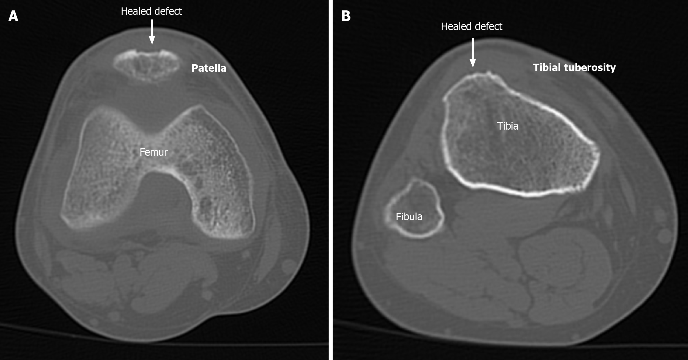 Figure 1 Axial non-contrast computed tomography cuts showing healed patellar and tibial tuberosity donor sites in a patient after 1 year.