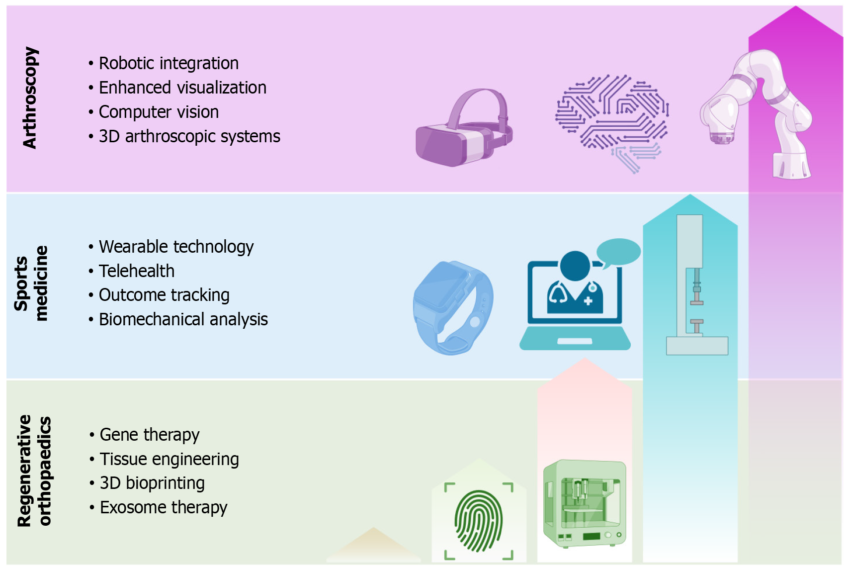 Infographic summarizing recent innovations in arthroscopy (robotic integration, enhanced visualization, computer vision, and three-dimensional (3D) arthroscopic systems), sports medicine (wearable technology, telehealth, outcome tracking, and biomechanical analysis), and regenerative orthopedics (gene therapy, tissue engineering, three-dimensional bioprinting, and exosome therapy). Each specialty is represented with distinct color coding and icons to highlight the emerging tools shaping future clinical practice.