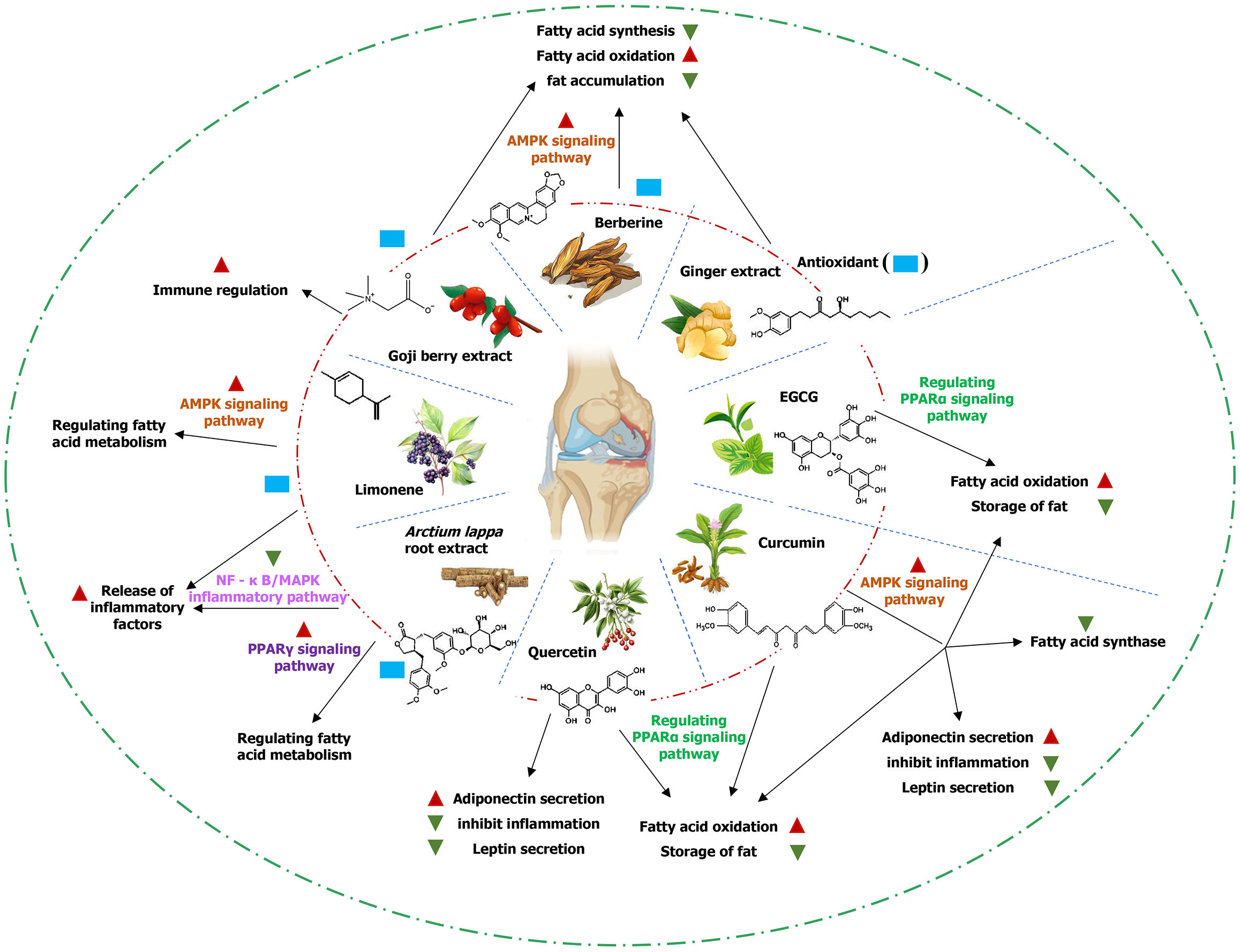 Representative phytochemicals, including curcumin, green tea polyphenols, quercetin, and other natural products, act on multiple molecular targets to modulate key signaling cascades such as the AMP-activated protein kinase pathway, peroxisome proliferator-activated receptor-α/peroxisome proliferator-activated receptor-γ pathways, and the nuclear factor kappa-light-chain-enhancer of activated B cells/mitogen-activated protein kinase inflammatory pathway. By regulating these pathways, phytochemicals exert anti-inflammatory, antioxidative, and chondroprotective effects that contribute to slowing osteoarthritis progression. In the diagram, red triangles indicate promotion or activation of signaling events, green triangles represent inhibition, and blue rectangles denote antioxidative effects, thereby providing a visual summary of the integrated lipid metabolism-related regulatory mechanisms. AMPK: AMP-activated protein kinase; NF-κB: Nuclear factor kappa-light-chain-enhancer of activated B cells; MAPK: Mitogen-activated protein kinase; PPAR: Peroxisome proliferator-activated receptor; EGCG: Epigallocatechin gallate.