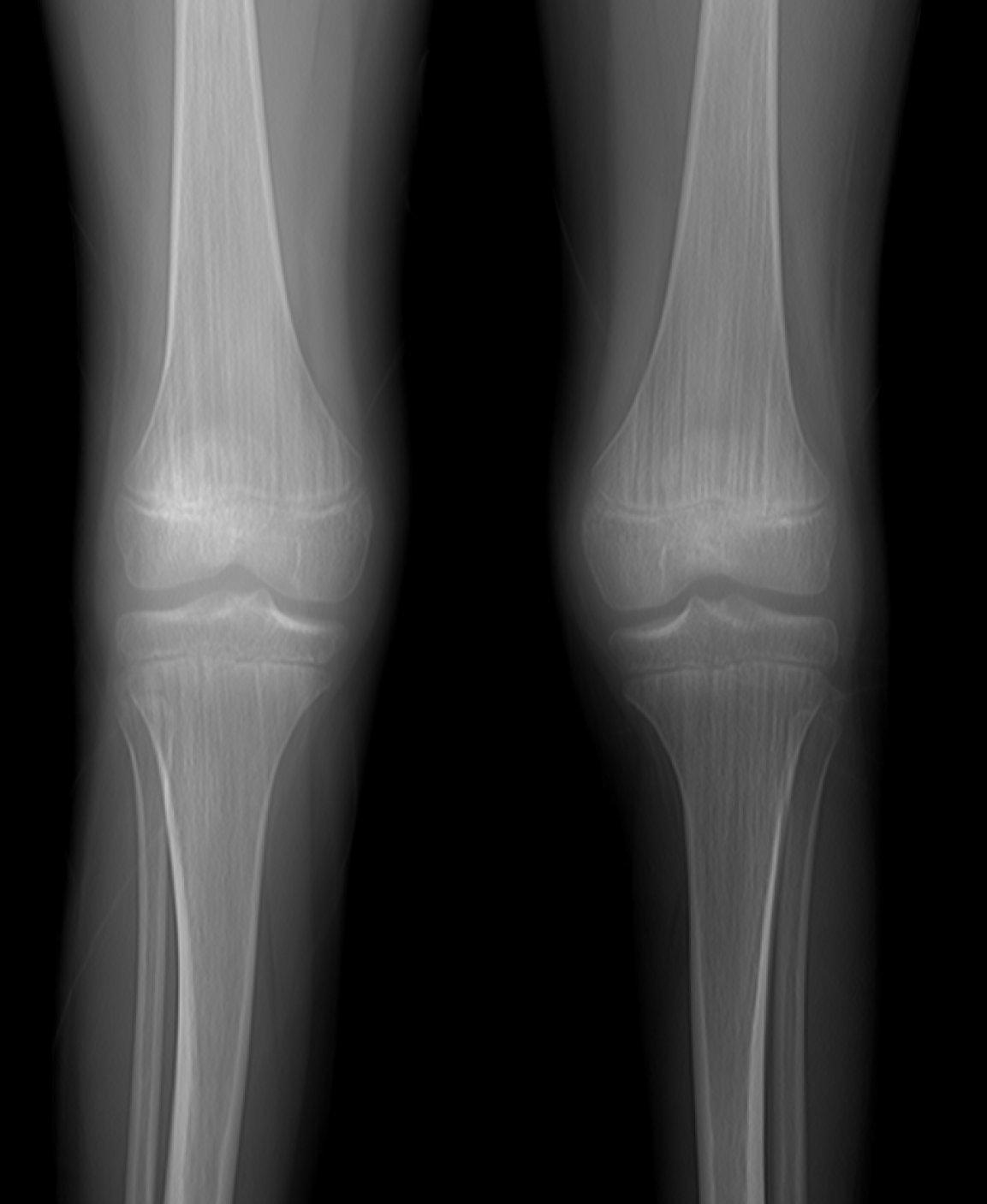 Vertical striations in the metaphyseal regions of the femoral and tibial bones on radiographs.