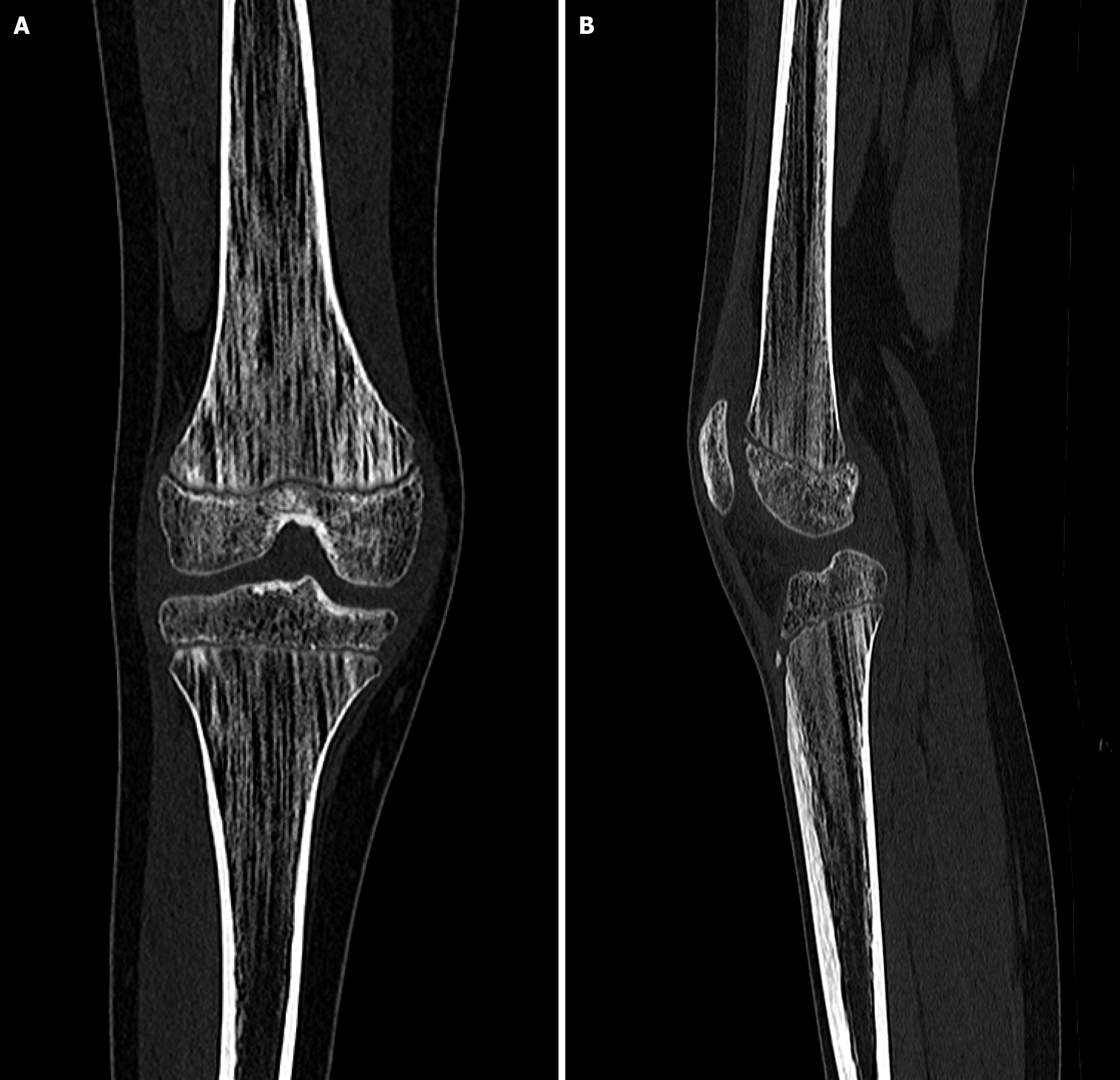 Figure 3 Vertical striations in the metaphyseal regions of the femoral and tibial bones on computed tomography scans.