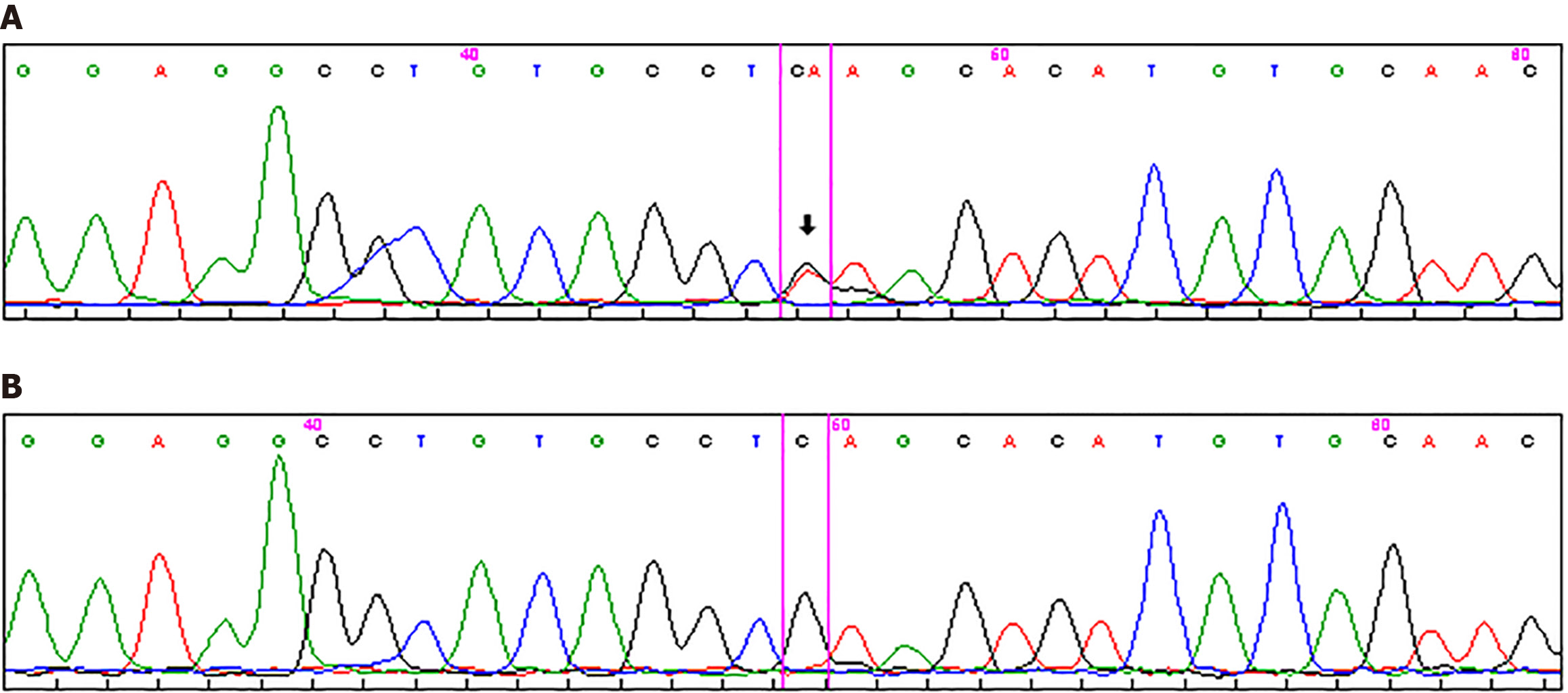 A and B: The proband (A) carries the heterozygous c.800C>A variant in the AMER1 gene (arrow), which is absent in his unaffected mother (B).