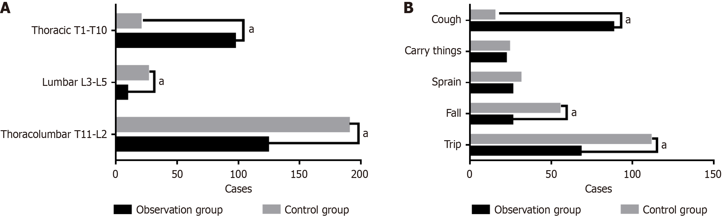 A: Fracture location; B: Cause of fracture. The horizontal axis represents the type of fracture location/cause, and the vertical axis represents the number of cases. aP < 0.05. T: Thoracic vertebrae; L: Lumbar vertebrae.