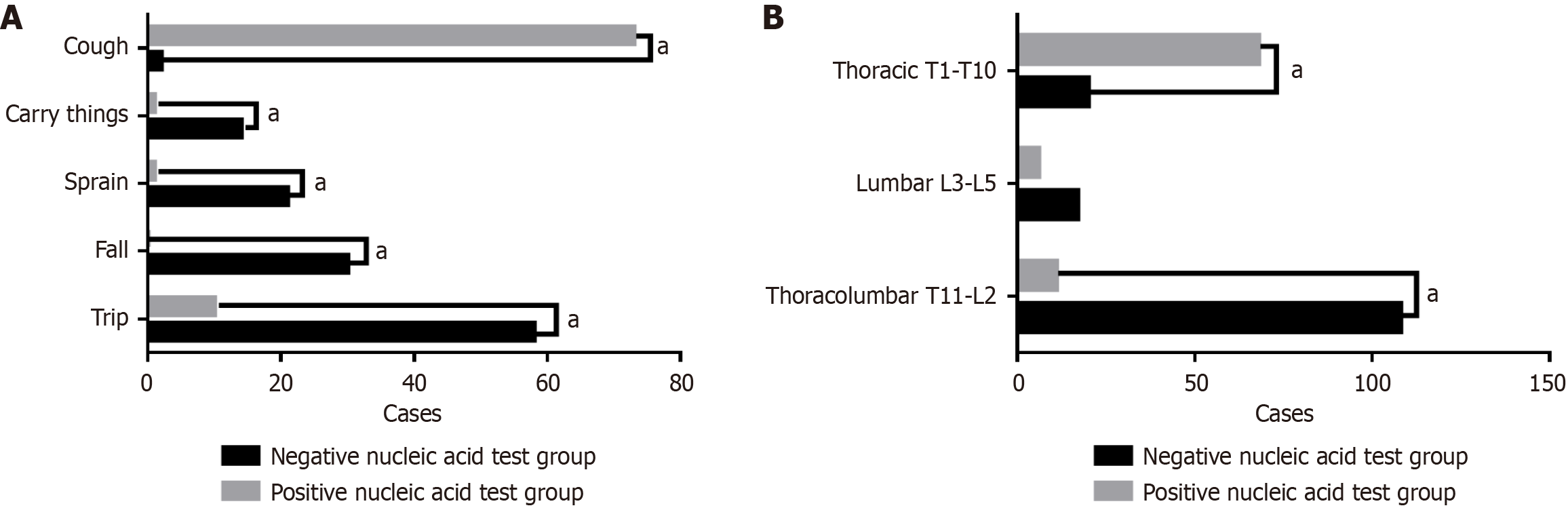 A: Comparison of causes of fractures between subgroups with different nucleic acid test results; B: Comparison of fracture locations between subgroups with different nucleic acid test results. The horizontal axis represents the type of fracture cause/Location, and the vertical axis represents the number of cases. aP < 0.05. T: Thoracic vertebrae; L: Lumbar vertebrae.
