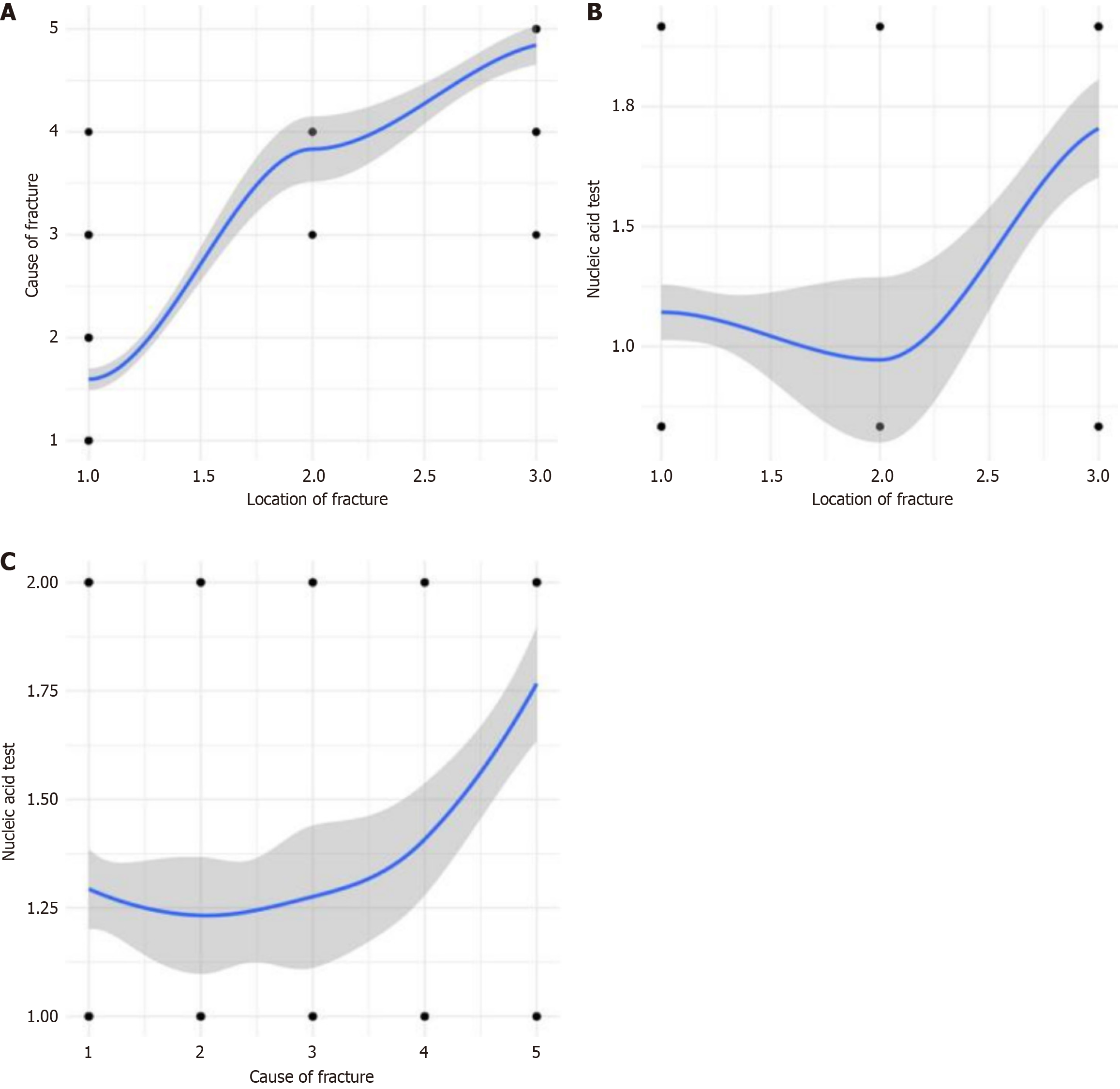 A: Correlation analysis chart between cause of fracture and fracture location; B: Correlation analysis chart between nucleic acid test result and fracture location (thoracic vertebra); C: Correlation analysis chart between nucleic acid test result and cause of fracture. The horizontal axis represents fracture location/cause of fracture, and the vertical axis represents nucleic acid test result/cause of fracture/fracture location.