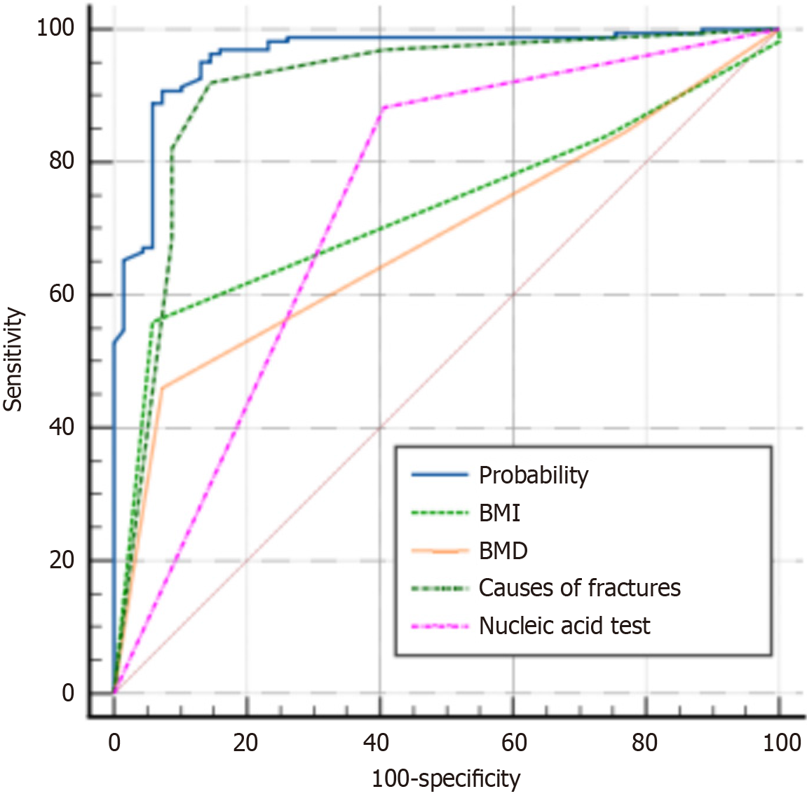 The horizontal axis represents 100 - specificity, and the vertical axis represents sensitivity. Different curves represent different influencing factors: Probability, body mass index, bone mineral density, causes of fractures, and nucleic acid test. BMI: Body mass index; BMD: Bone mineral density.