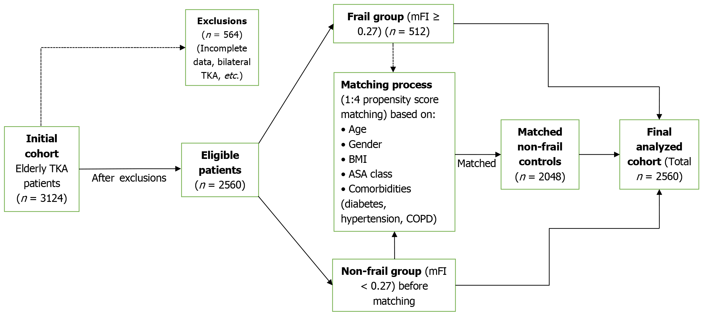 ASA: American Society of Anesthesiologists; BMI: Body mass index; COPD: Chronic obstructive pulmonary disease; mFI: Modified Frailty Index; TKA: Total knee arthroplasty.