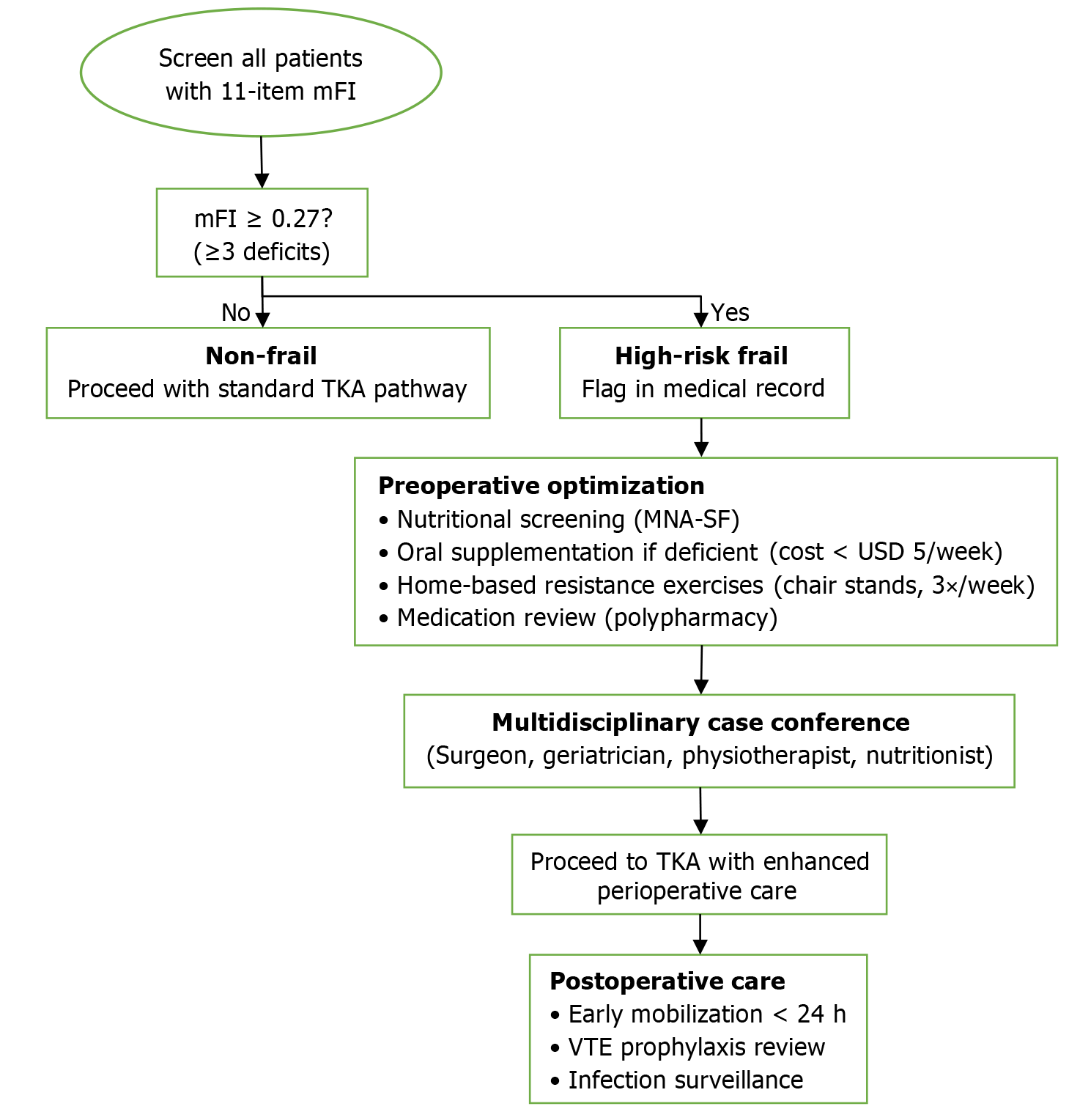 Patients are screened using the 11-item modified Frailty Index. Those with modified Frailty Index ≥ 0.27 undergo targeted, low-cost preoperative optimization and multidisciplinary review before proceeding to surgery with enhanced perioperative care. mFI: Modified Frailty Index; MNA-SF: Mini nutritional assessment-short form; TKA: Total knee arthroplasty; USD: United State Dollar; VTE: Venous thromboembolism.