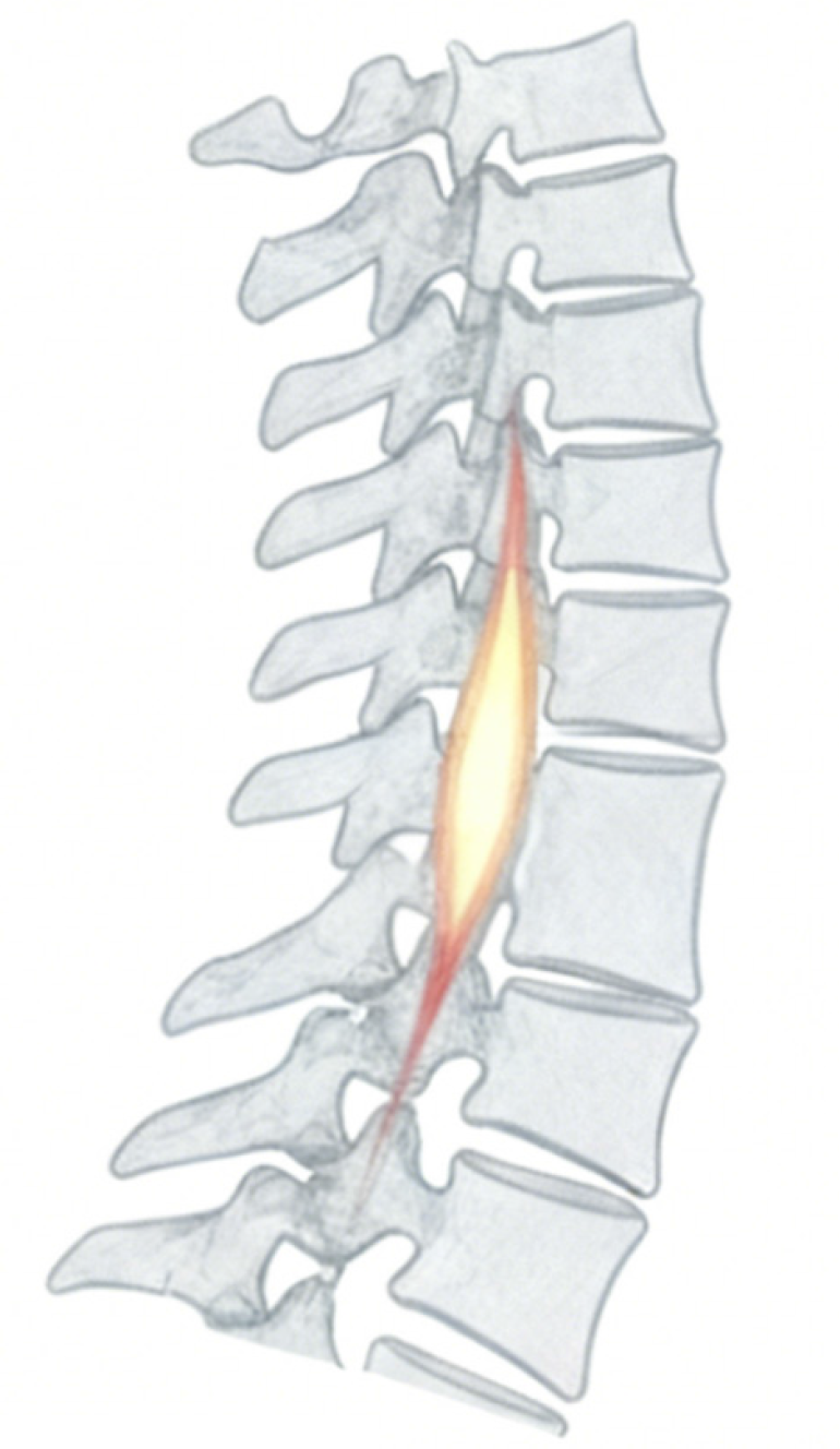 T2-weighted sagittal magnetic resonance imaging of the spine, where the highlighted region denotes the tissue bridge between adjacent vertebral segments.