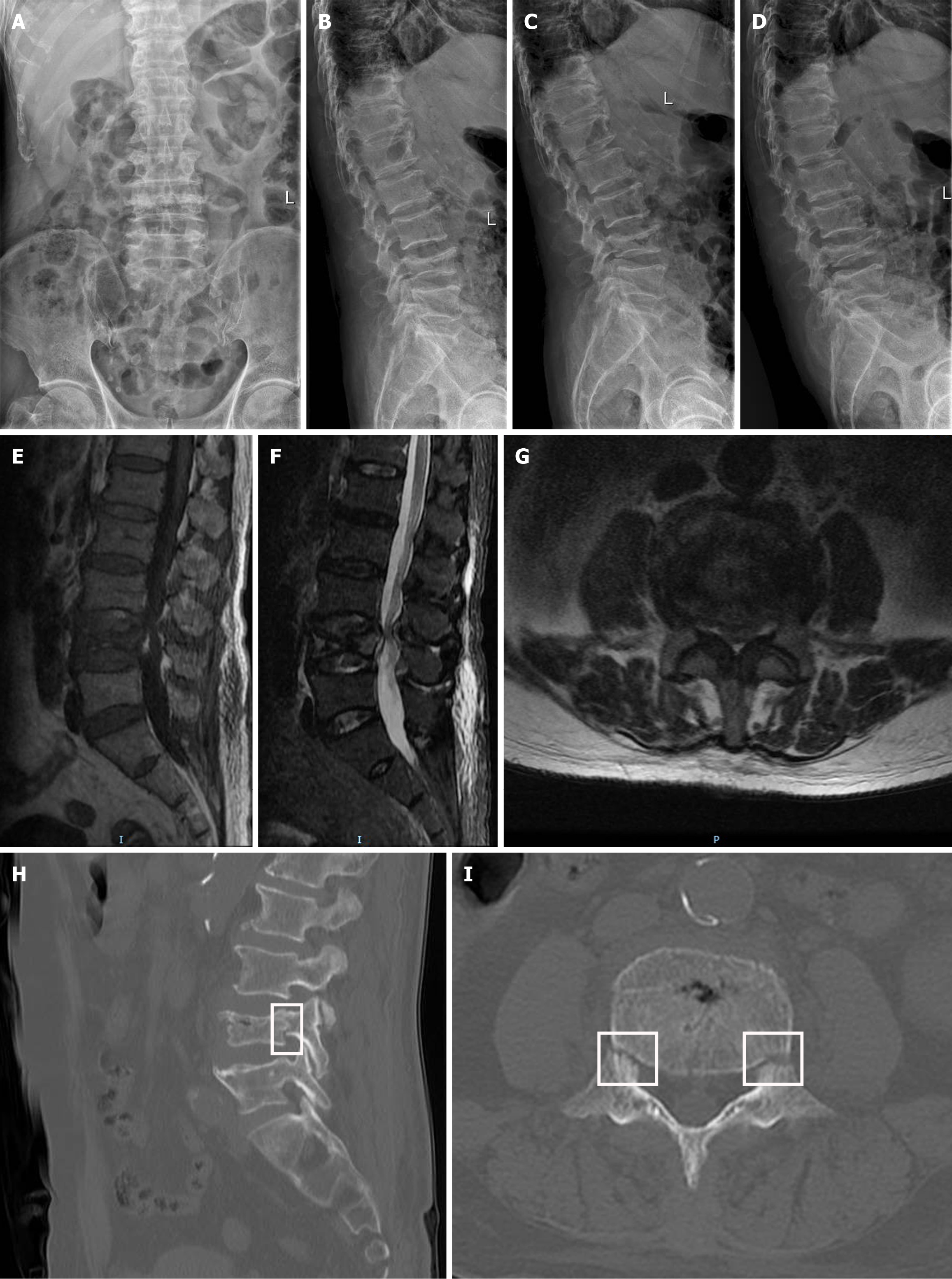 A-D: Preoperative lumbar spine digital radiography in anteroposterior, lateral, and flexion-extension views, indicating compression change of L4 vertebrae; E-G: Preoperative magnetic resonance imaging included T1-weighted imaging (E), short tau inversion recovery imaging (F), and axial images at the inferior margin of the L3/4 intervertebral disc level (G), indicating bone marrow edema of L4 vertebrae and spinal canal stenosis at the L3/4 intervertebral disc level; H and I: Sagittal (H) and axial (I) views of the L4 vertebra on preoperative computed tomography, the pedicle fracture sites were marked within the white frame.