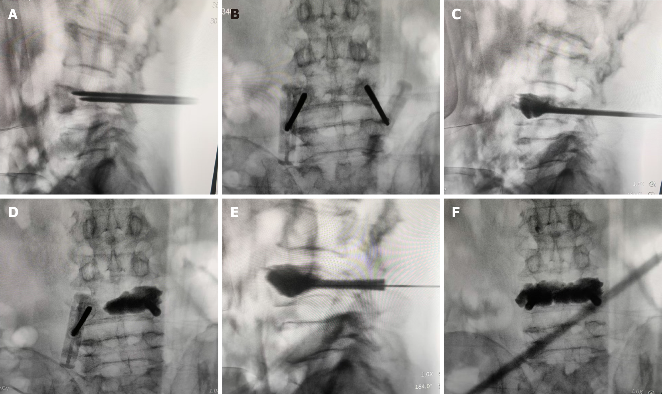 A and B: Percutaneous bilateral pedicle puncture; C: Intraoperative fluoroscopy-guided polymethyl methacrylate injection; D: Insertion of a headless cannulated compression screw into the vertebral body along the Kirschner wire; E and F: An identical procedure on the contralateral side (E) and assessment of the cement distribution and positioning of the internal fixation via fluoroscopic imaging (F).