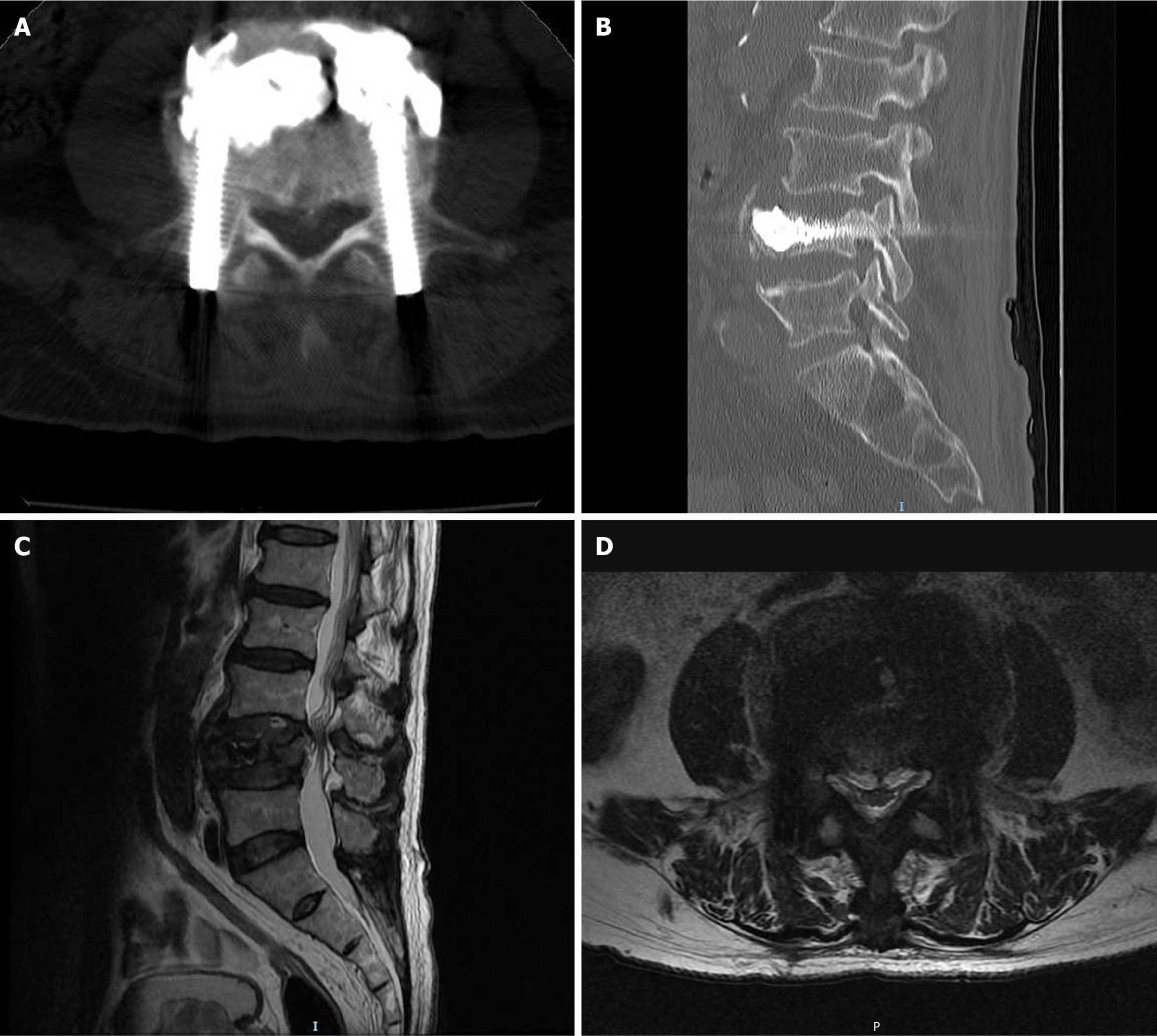 A and B: Postoperative sagittal and axial computed tomography images of the lumbar spine; C: Postoperative sagittal short tau inversion recovery image of lumbar spine magnetic resonance imaging (MRI); D: Postoperative lumbar MRI transverse section image acquired at the lower margin of the L3/4 intervertebral disc level.