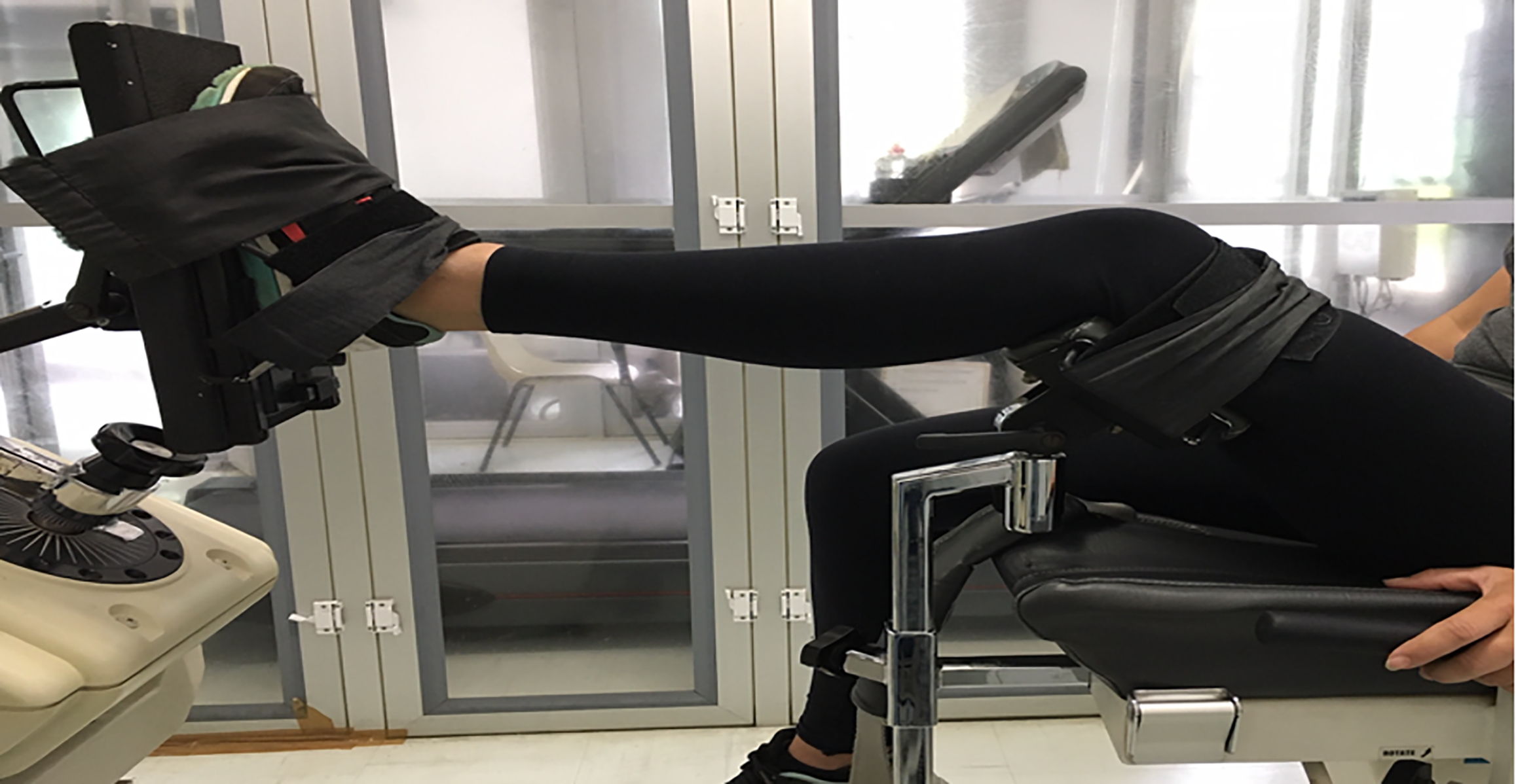 All participants were asked to read and sign an informed consent form, and the methods were performed according to the relevant guidelines and regulations. For proper and safe positioning on the machine, participants were seated and secured with straps to stabilize the trunk and hips. The ipsilateral knee remained at 20° of plantar flexion, so the leg remained parallel to the ground, on padded support, and was secured with a Velcro strap. The foot was fixed to the platform in a plantigrade position, using the same straps to allow free ankle movement in all directions (Figure 1)[14].