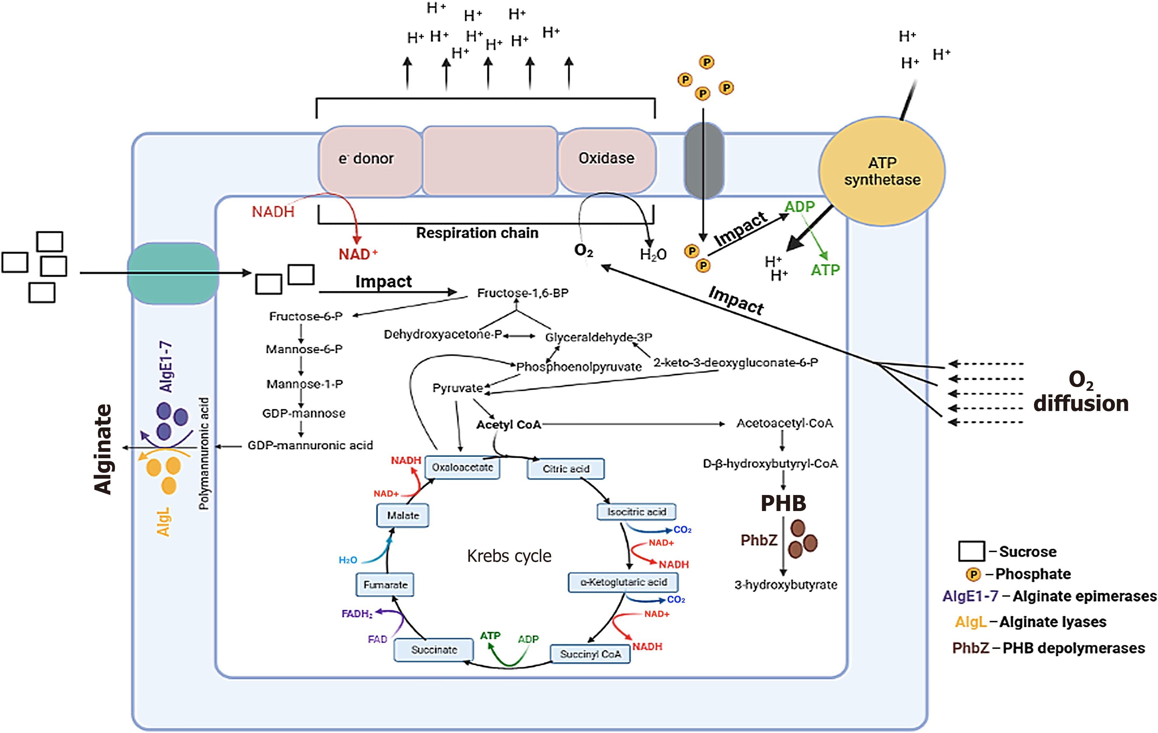 By the 2020s, the alginate market was worth around 10 billion dollars[17]. Currently, alginate is only produced commercially from brown algae[18]. However, there are disadvantages to obtaining alginate from algae. Firstly, the chemical composition of synthesized alginate chains depends on the metabolic needs of the organisms producing them. These needs are associated with changes in external conditions, such as seasonal changes, different development cycles and the time at which they are collected. Therefore, it is impossible to ensure quality control in the production of raw materials[19]. Secondly, the extraction process itself involves rough processing (acid or alkaline extraction), which leads to alteration (β-elimination) and partial destruction of the final product. In contrast, producing alginate from microorganisms such as Azotobacter bacteria involves controlled synthesis under laboratory conditions, ensuring consistency of production. One of our previous studies demonstrated the optimization of the alginate synthesis process by the Azotobacter vinelandii 12 bacterial strain. Three parameters that directly affect biopolymer metabolism were varied to maximize alginate production: Sucrose and phosphate concentrations in the medium, and the level of aeration (Figure 3)[10]. As shown in Figure 3, the alginate synthesis metabolic pathway consists of a cascade of enzymatic reactions. These begin with the algD dehydrogenase reaction, followed by alg8 chain polymerization[20-22], and end with the various MM modifications by acetylase complexes and epimerization. During this process, mannuron residues are converted to guluron residues[23-25]. The expression of all genes encoding enzymes of alginate synthesis can be directly regulated by external conditions such as the concentration of substances in the growth medium or the level of aeration[10]. Thus, in our laboratory, we were able to optimize the synthesis of bacterial alginate by the Azotobacter vinelandii 12 bacterium and obtain alginates with defined physicochemical properties, such as molecular weight (MW), M/G composition, and acetylation level, by cultivating and extracting the polymer under certain conditions[10,12]. The isolation and purification process (in our laboratory) for the polymer is also carried out under milder conditions, without the use of strong acids or alkalis. Initially, the bacterial biomass is dissolved in a strong ionic 1 M NaCl solution containing EDTA as a cation chelator. After centrifugation, the resulting supernatant is precipitated with alcohol to form a precipitate, which is then dried by lyophilization. The resulting dry precipitate is then purified by dissolution in a 1 M NaCl solution, followed by dialysis against 1 L of 0.1 M NaCl at 4 °C for 24 hours[10]. The purified bacterial alginate was much cleaner than commercial alginate from algae by further analysis of its chemical structure and assessment of cytotoxicity. Thirdly, bacterial alginate has unique physicochemical properties and improved functional characteristics, unlike algal alginate. The key difference is that bacterial alginate contains O-acetylated groups in the C2 and C3 positions of the mannuronic acid residues in the alginate chain[26]. This arrangement of acetyl groups improves the polymer's mechanical-viscosity properties and affects the interaction of calcium ions and the activity of mannuronate epimerase and mannuronate lyase enzymes[27]. Therefore, bacterial alginate has greater potential for use in various fields than algal alginate, particularly in orthopedics, where strong hydrogel polymers are important.