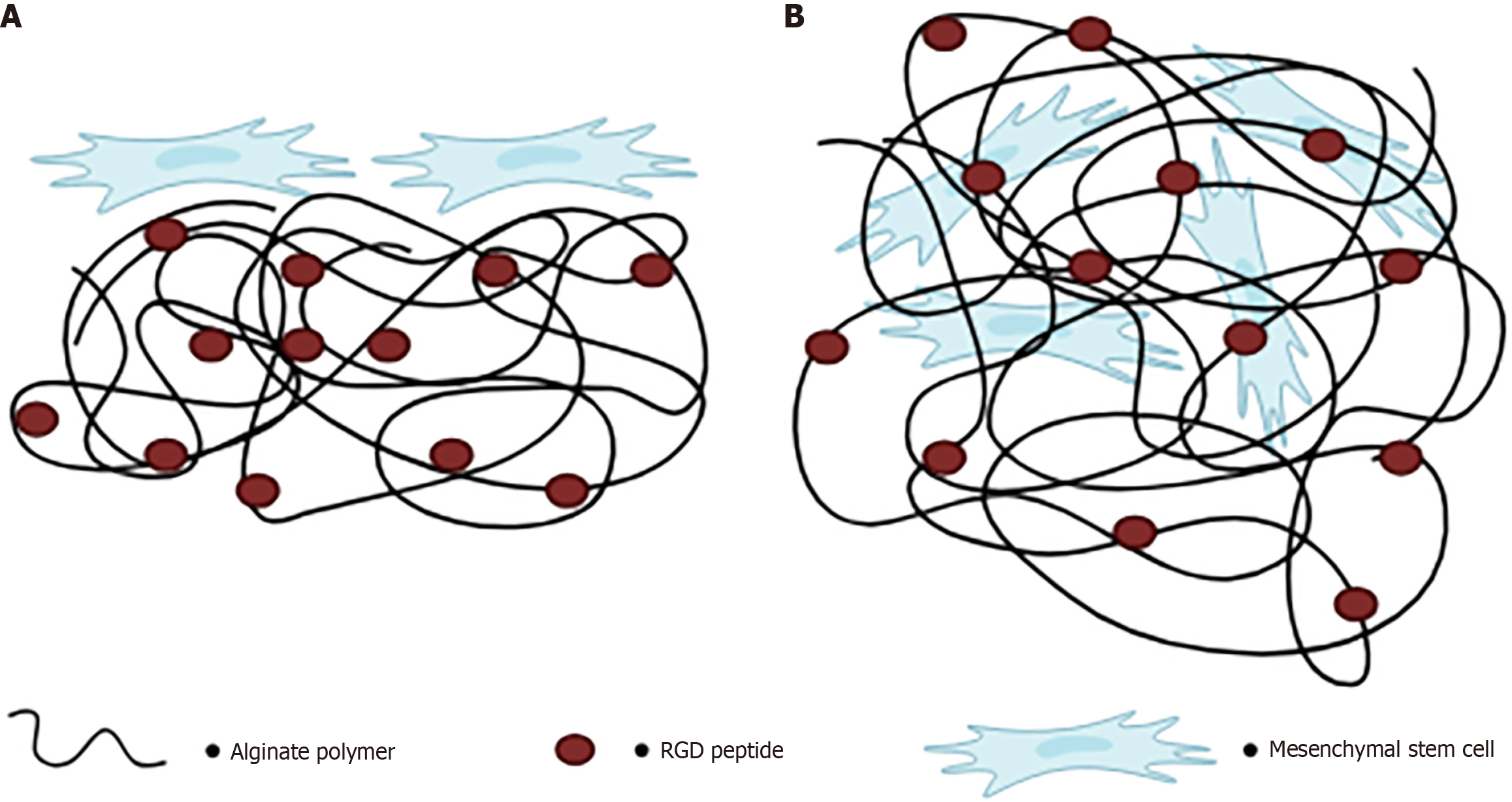 Over the past five years, the number of studies on alginate as a biomaterial in the form of hydrogels, scaffolds or microparticles for bone repair has grown exponentially. The advantages of alginate gels include their ability to conform to irregularly shaped bone defects, the ease with which various cellular growth factors can be released, and the ease with which ligands can be attached to them, as demonstrated by peptide motif RGD attachment (Figure 4)[28,29].
