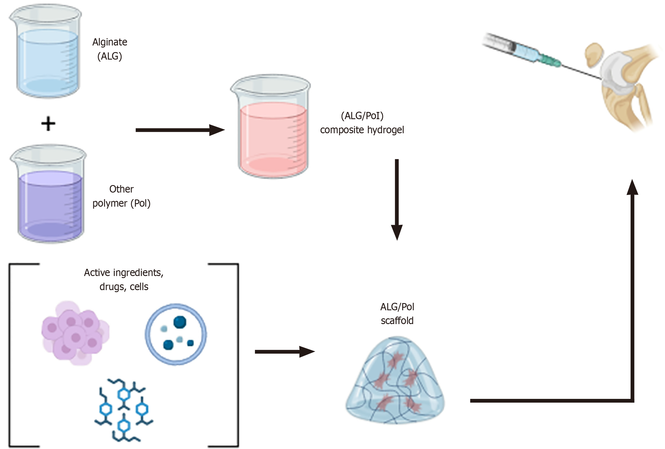 In recent years, injectable alginate-based hydrogels have become one of the most common approaches to cartilage joint healing[53-57]. All of these studies have a similar experimental design involving the following three steps: (1) The development of an alginate-based hydrogel; (2) The incorporation of active agents, such as adipose-derived stem cells (ADSCs) or 4-octylitaconate, into the composite hydrogel; and (3) The injection of the developed scaffold into the site of cartilage joint injury (Figure 5). For example, in Liao et al's study on the injection of alginate/gelatin microspheres containing ADSCs into the site of femoral trochlear cartilage injury in rats, it was demonstrated that the alginate/gelatin microspheres containing ADSCs produced superior cartilage healing results[54]. This was primarily evident in the fact that, 12 weeks after surgery, the defect site was almost completely filled with cartilage-like tissue, in contrast to the other experimental groups. There were also significantly higher scores on the International Cartilage Repair Society (ICRS) scale[58] and the modified Wakitani scale[59] in the alginate/gelatin group with ADSC inclusion[54]. Similarly, in related work by Chinese scientists, naringenin, a compound from the flavonoid group, was loaded into the alginate/bioglass hydrogel as the active ingredient instead of cells[57]. The results showed that the hydrogel scaffold with naringenin had better performance in both the ICRS and the histological evaluation of the cartilage repair model[57].