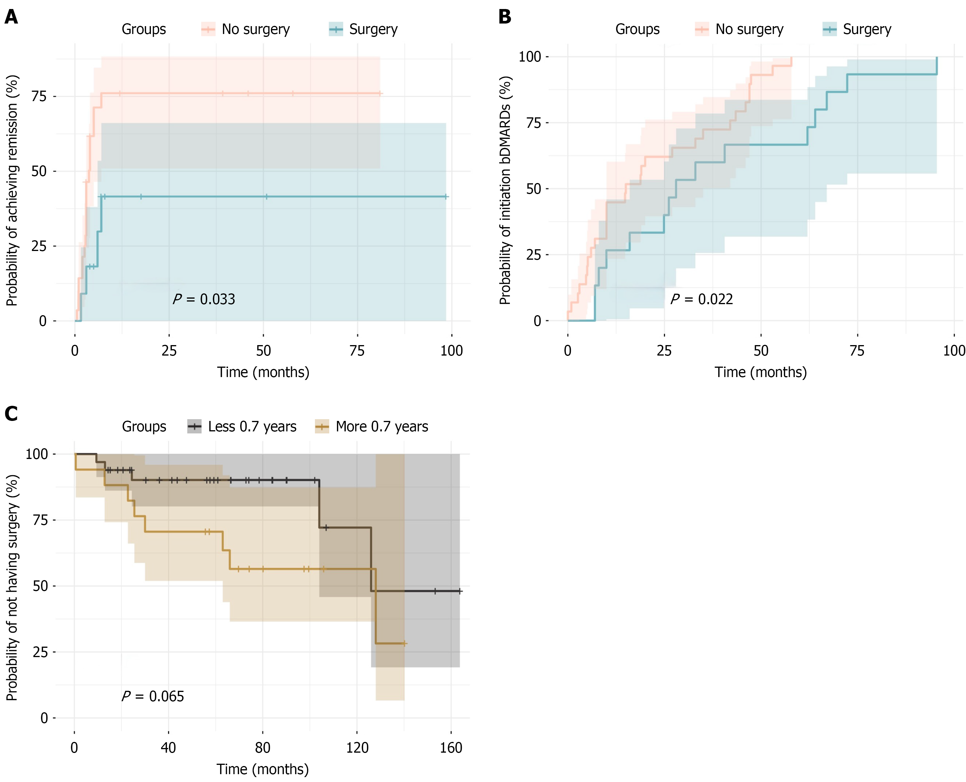 A: The probability of the remission achievement on methotrexate depending on the surgical intervention; B: The probability of biologic disease-modifying antirheumatic drug initiation depending on the surgical intervention; C: The probability of not having surgical intervention depending on the initiation time of methotrexate. bDMARDs: Biologic disease-modifying anti-rheumatic drugs.