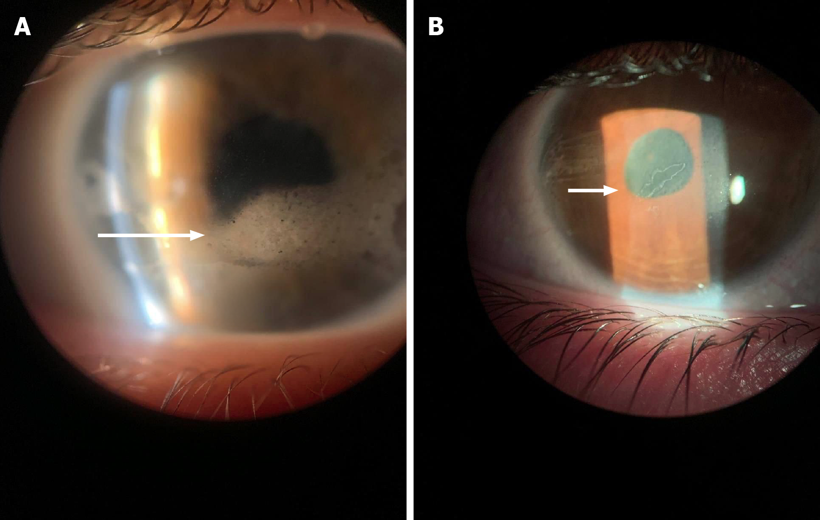 A: Band keratopathy (arrow); B Posterior synechia (arrow).