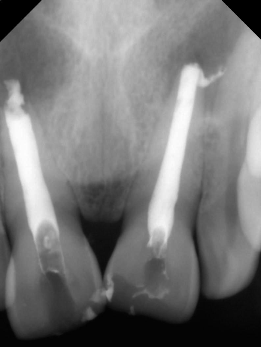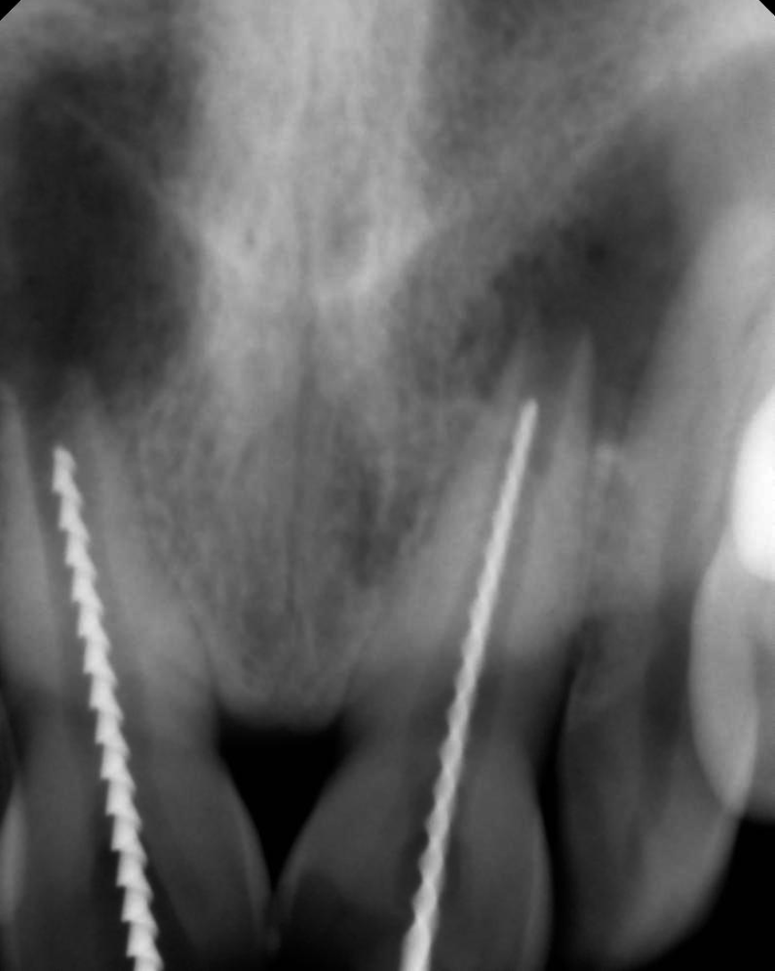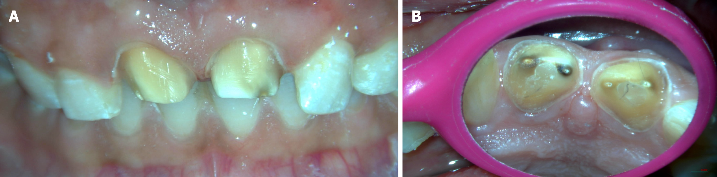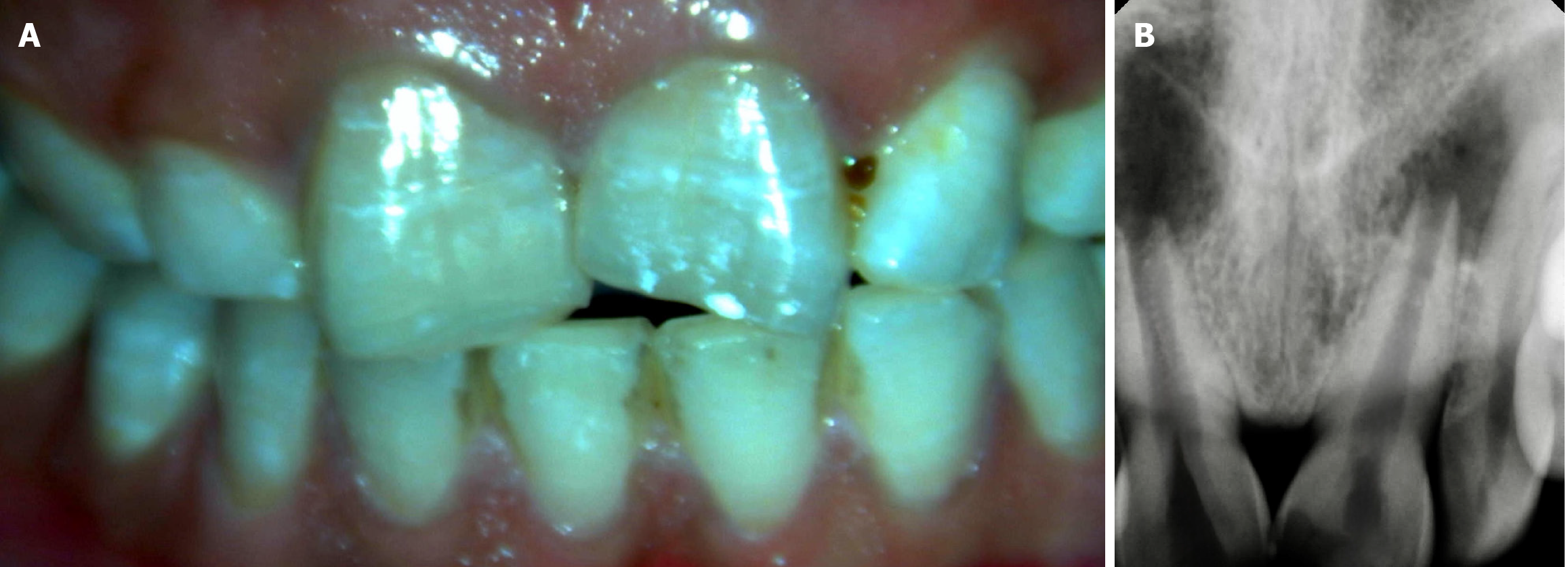 A: Clinical image wrt 11 and 21; B: Radiograph wrt 11 and 21.