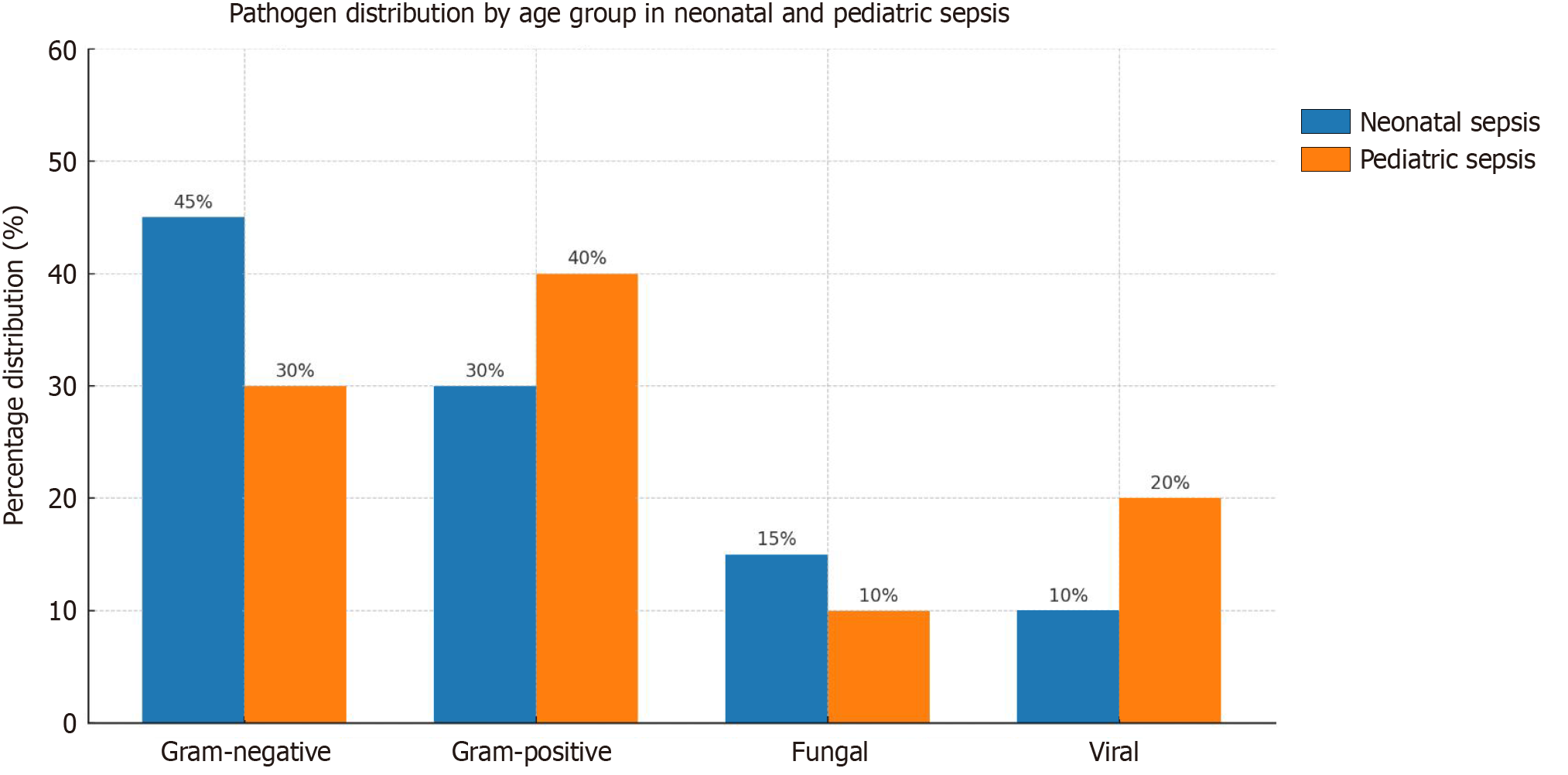Pathogen distribution by age group in neonatal and pediatric sepsis.