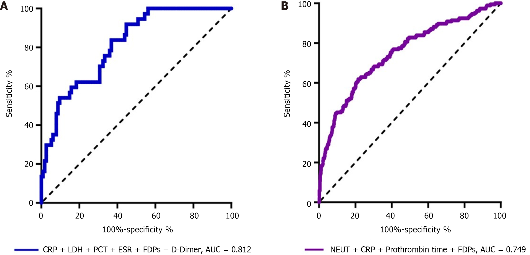 A: Aged 2-5 years; B: Aged 6 -13 years old. AUC: Area under the curve; CRP: C-reactive protein; ESR: Erythrocyte sedimentation rate; FDPs: Fibrin and fibrinogen degradation products; LDH: Lactate dehydrogenase; NEUT: Neutrophils; PCT: Procalcitonin.
