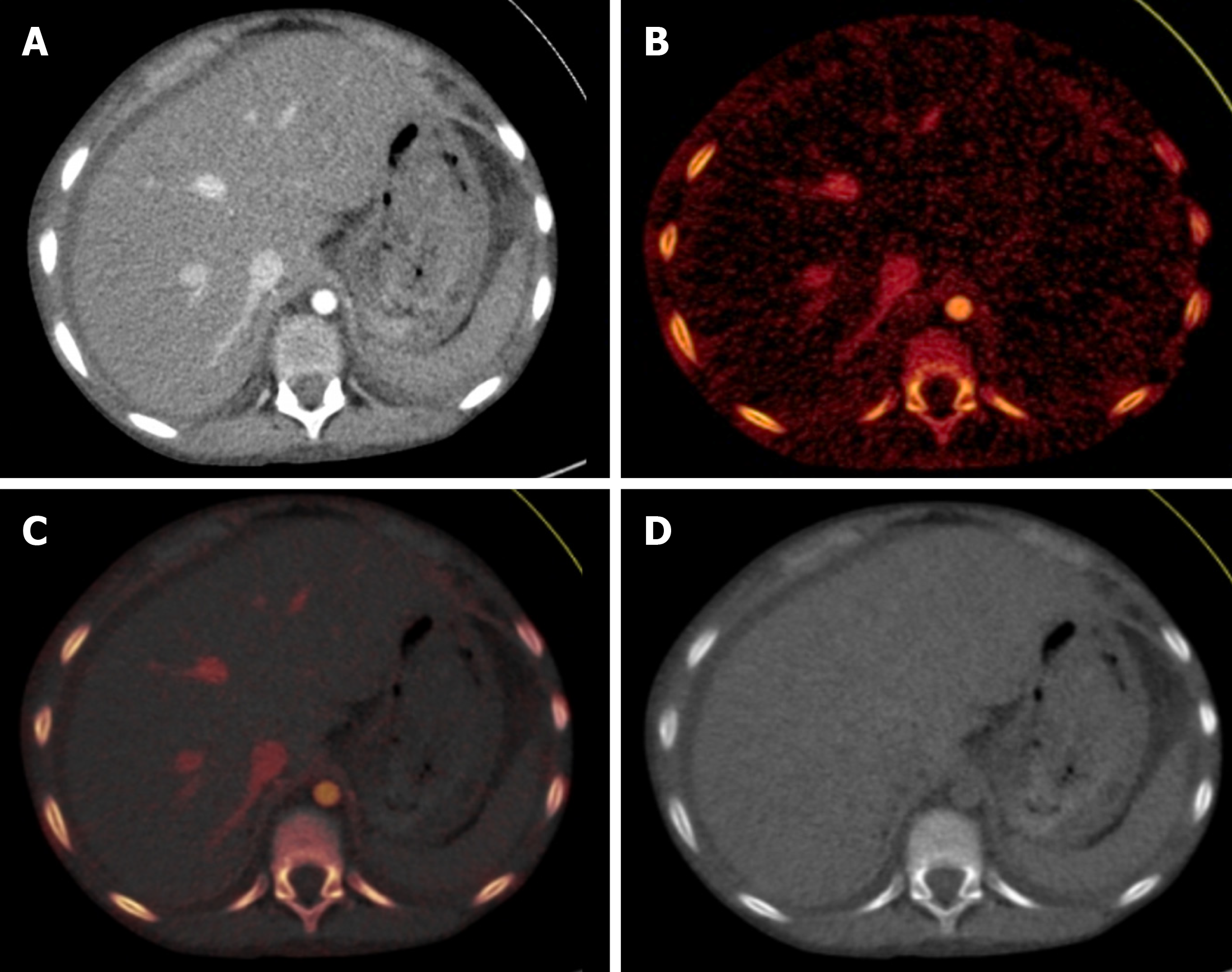 Axial sections of the upper abdomen at the level of the liver showed normal liver. A: Blended contrast-enhanced image; B: Iodine-specific image; C: Iodine overlay image with superimposed iodine map on gray–scale virtual non-contrast image; D: Virtual non-contrast image.
