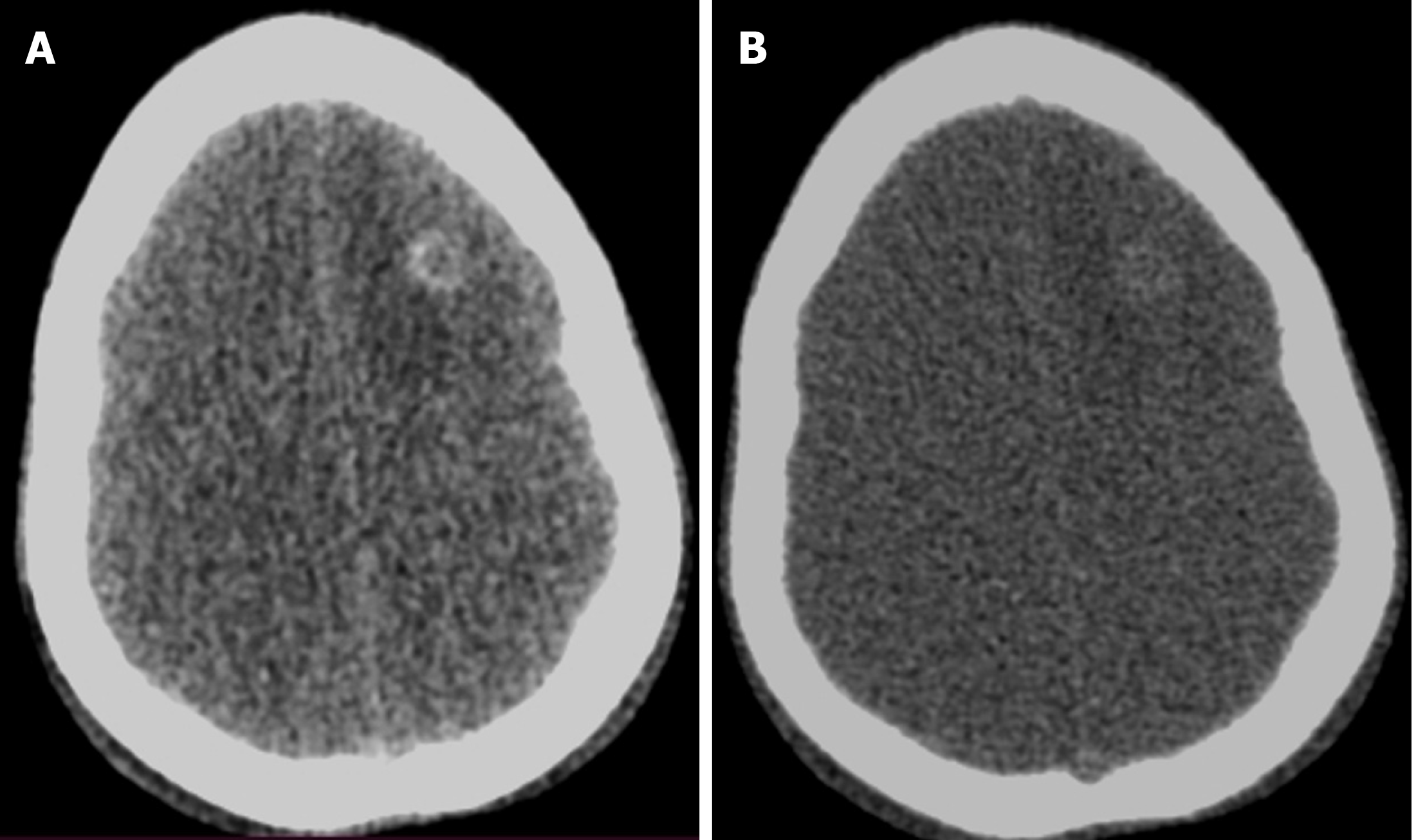 A: Axial section of contrast-enhanced CT head image at 70 kV showed better contrast enhancement of the wall in the ring-enhancing lesion with perilesional edema; B: There was only subtle contrast enhancement in the image obtained at 150 kV.