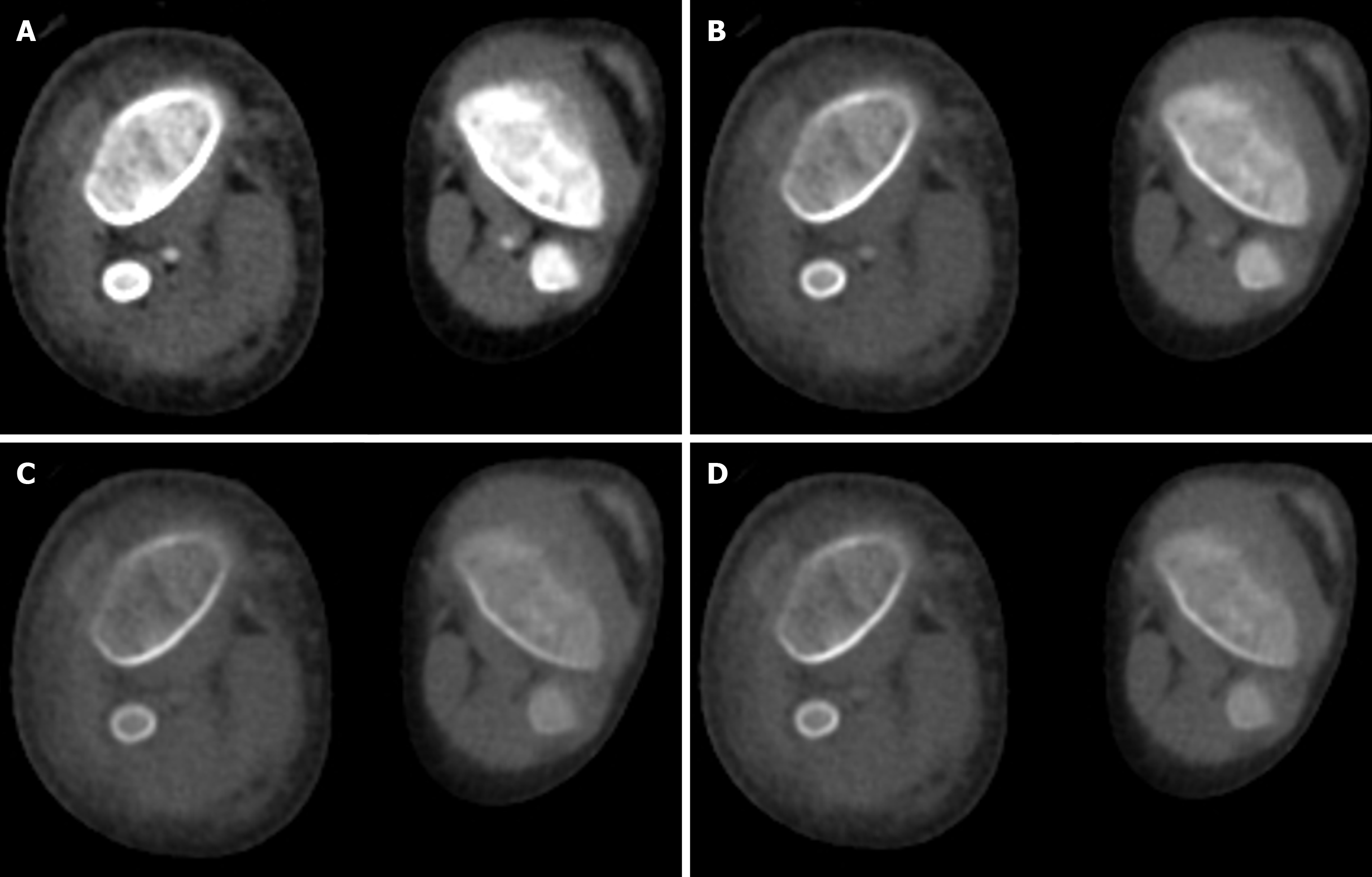 Axial virtual monoenergetic images of CT angiography of the bilateral lower limb vessels showed popliteal arteries. A: 40 kV; B: 80 kV; C: 120 kV; D: 160 kV. There was increased conspicuity of the vessels at low kV as compared with high kV. This application allows for the generation of acceptable image quality even with a suboptimal dose of contrast.
