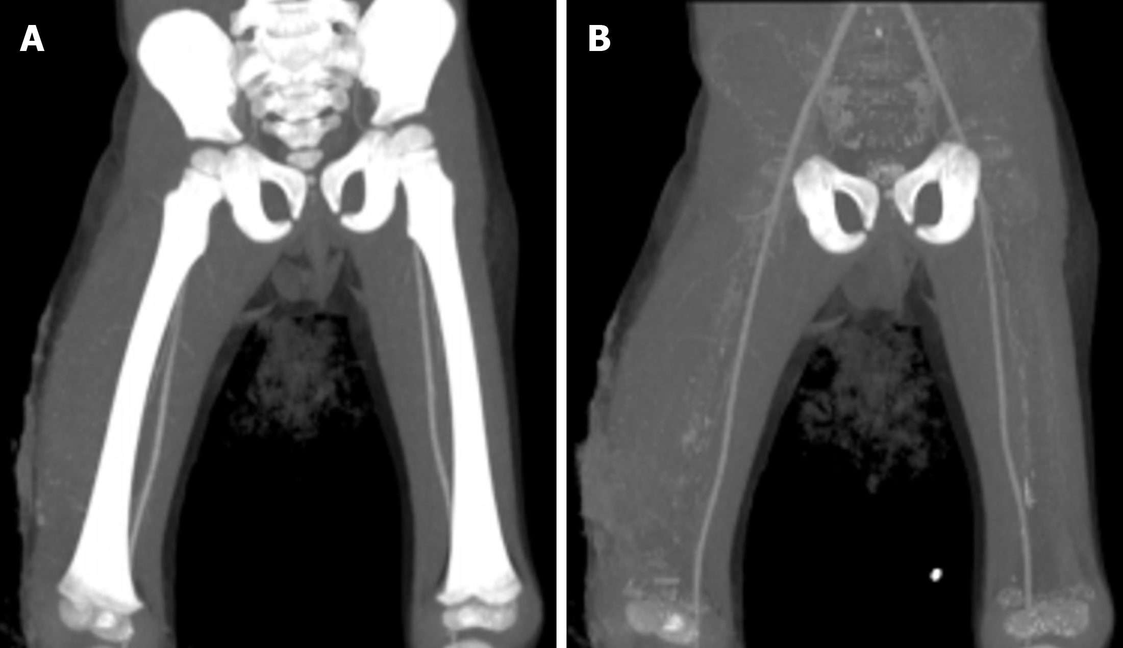 Coronal images of CT angiography of bilateral lower limb vessels to show the automated bone removal application of dual energy CT. A: Coronal maximum-intensity projection image showed bilateral superficial femoral arteries overlapped by bones, along with soft tissue swelling along the right thigh; B: Application of the bone removal tool of dual-energy CT enabled better delineation of the arteries and confirmed the absence of any pseudoaneurysm.