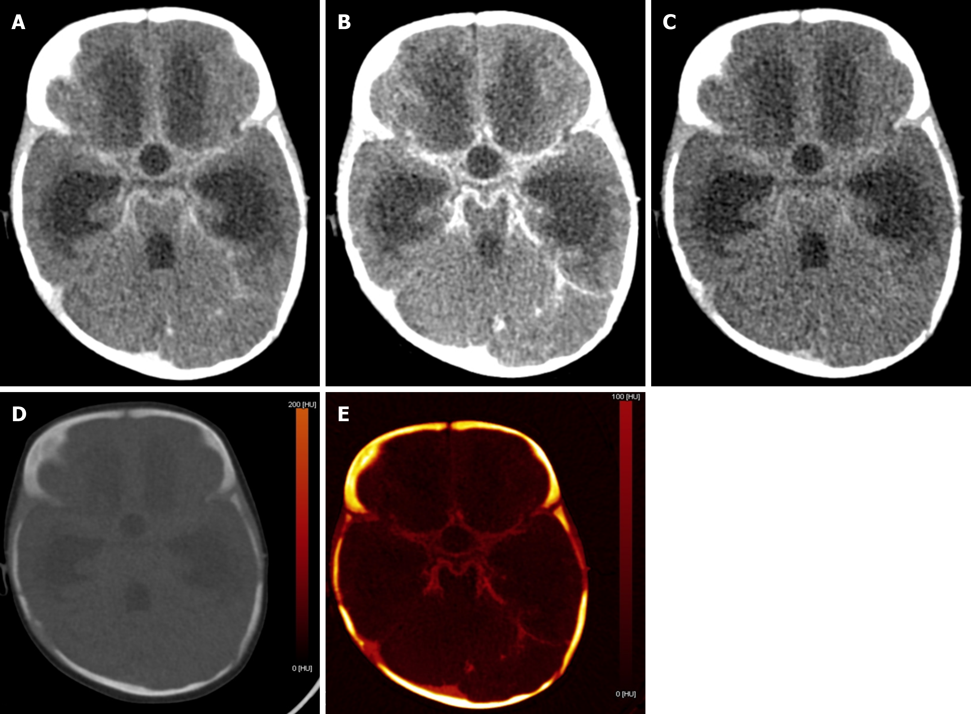 A: Axial blended contrast enhanced image showed abnormal leptomeningeal enhancement; B: Image at 70 kV showed marked increased contrast with increased conspicuity of the abnormal enhancement; C: Image at 150 kV showed decreased noise but at the cost of poor contrast; D: Virtual non-contrast image ruled out any abnormal bleed; E: Iodine-specific image showed iodine uptake in the region of hyperdensity, adding to the confidence in the diagnosis of meningitis.
