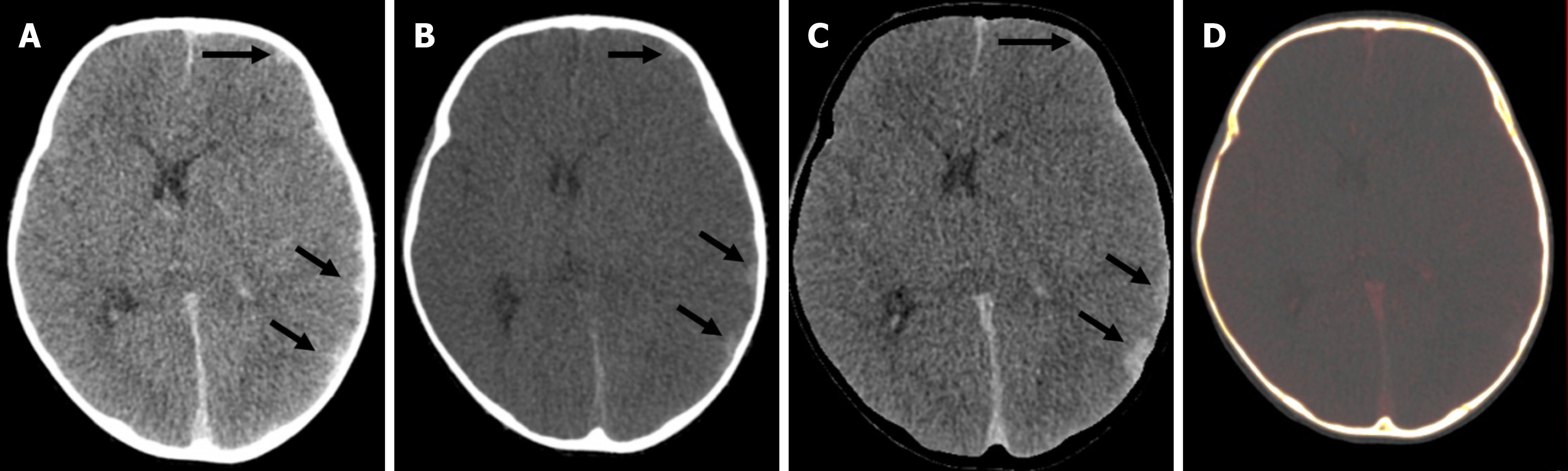 A: Axial mixed-enhanced CT head images showed subtle extra-axial high-density lesions (indicated by arrows) in the left frontal and parietal lobes, resulting in a slight midline shift to the opposite side; B: The virtual non-contrast image confirmed that the hyperdensity (arrows) represented an acute bleed and not abnormal enhancement; C: Bone removal tool of dual energy demonstrated the bleed more clearly (arrows); D: Iodine overlay image did not show any iodine uptake in the region of the bleed.