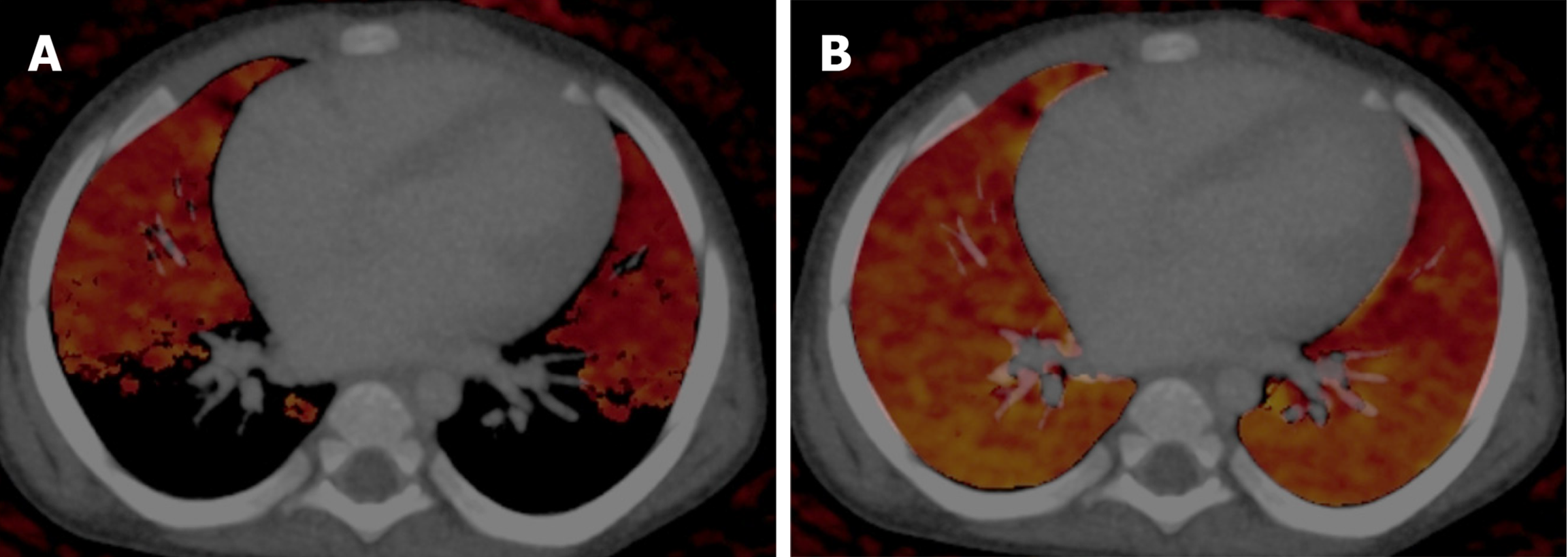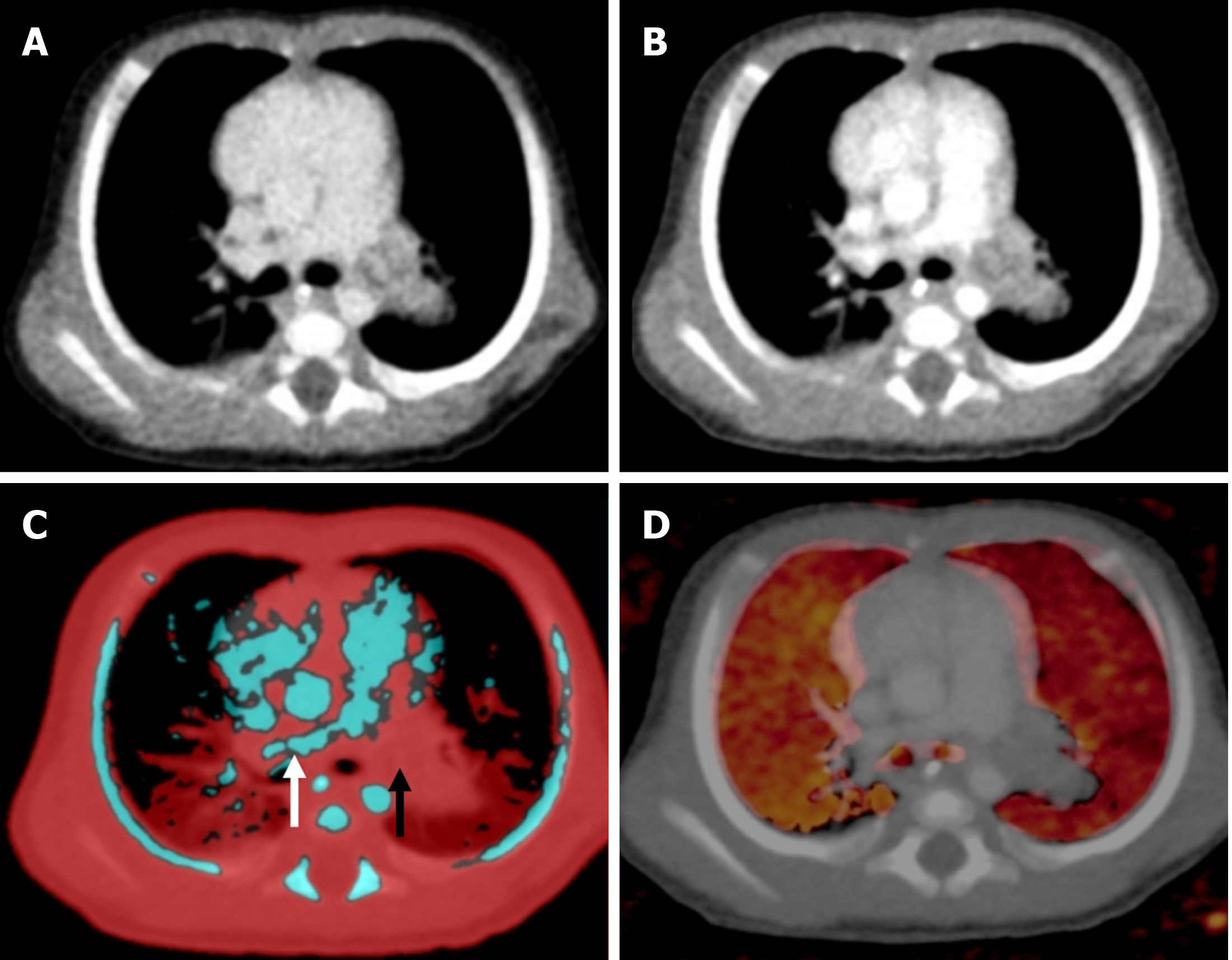A: Iodine defects were seen when the maximum threshold was set at -600 Hounsfield units; B: Lung parenchyma showed normal perfusion when the threshold was changed to -300 Hounsfield units. A higher threshold was needed in children to compensate for the higher lung density.