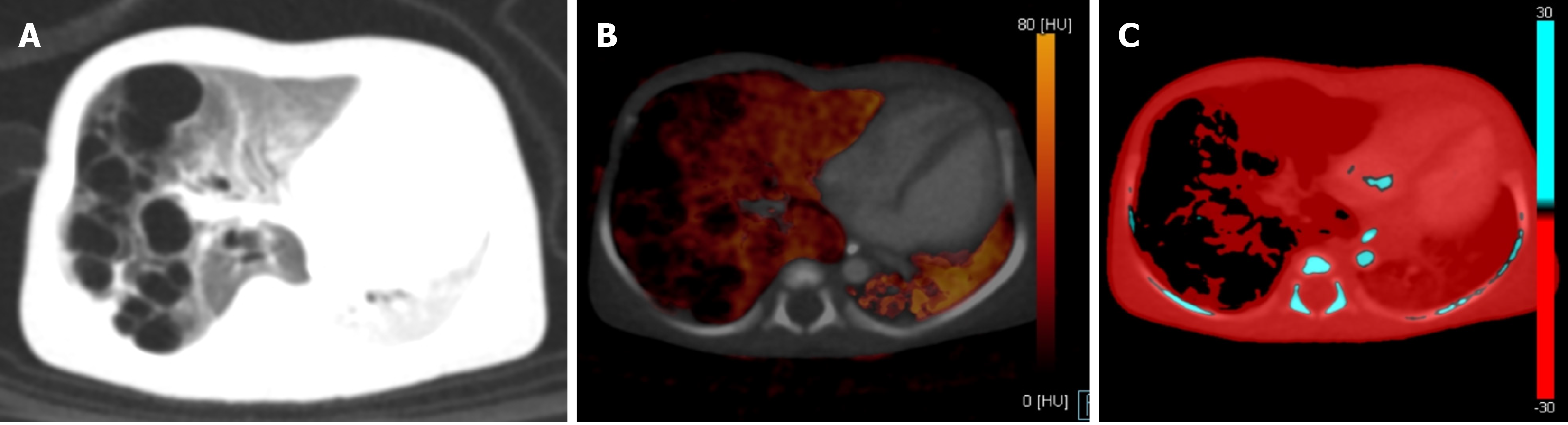 A: Axial lung window image showed multiple variable-sized cystic lesions interspersed in the right lung; B: Perfused blood volume image showed perfusion deficit in the affected areas; C: Lung vessel image superimposed on lung volume image showed no abnormal vasculature within or surrounding the lesion.