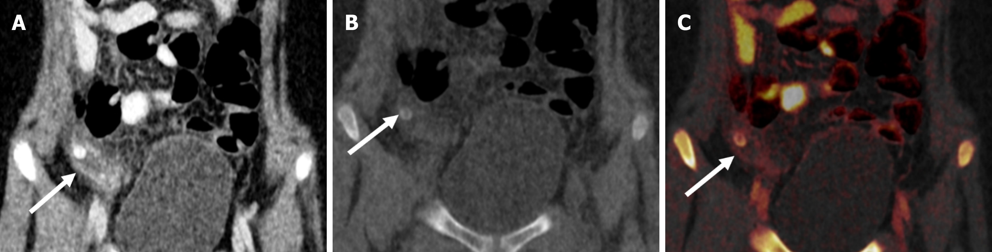A: Blended dual-energy contrast-enhanced coronal image showed circum ferential homogenously enhancing mural thickening involving the wall of the appendix (arrow), which was dilated and fluid-filled, suggestive of acute appendicitis; B: There was also the presence of an oval-shaped hyperdensity (arrow) within its lumen on virtual non-contrast image, suggestive of an appendicolith; C: The iodine overlay map showed high iodine uptake in its wall (arrow), representing the hyperemia associated with active inflammation.