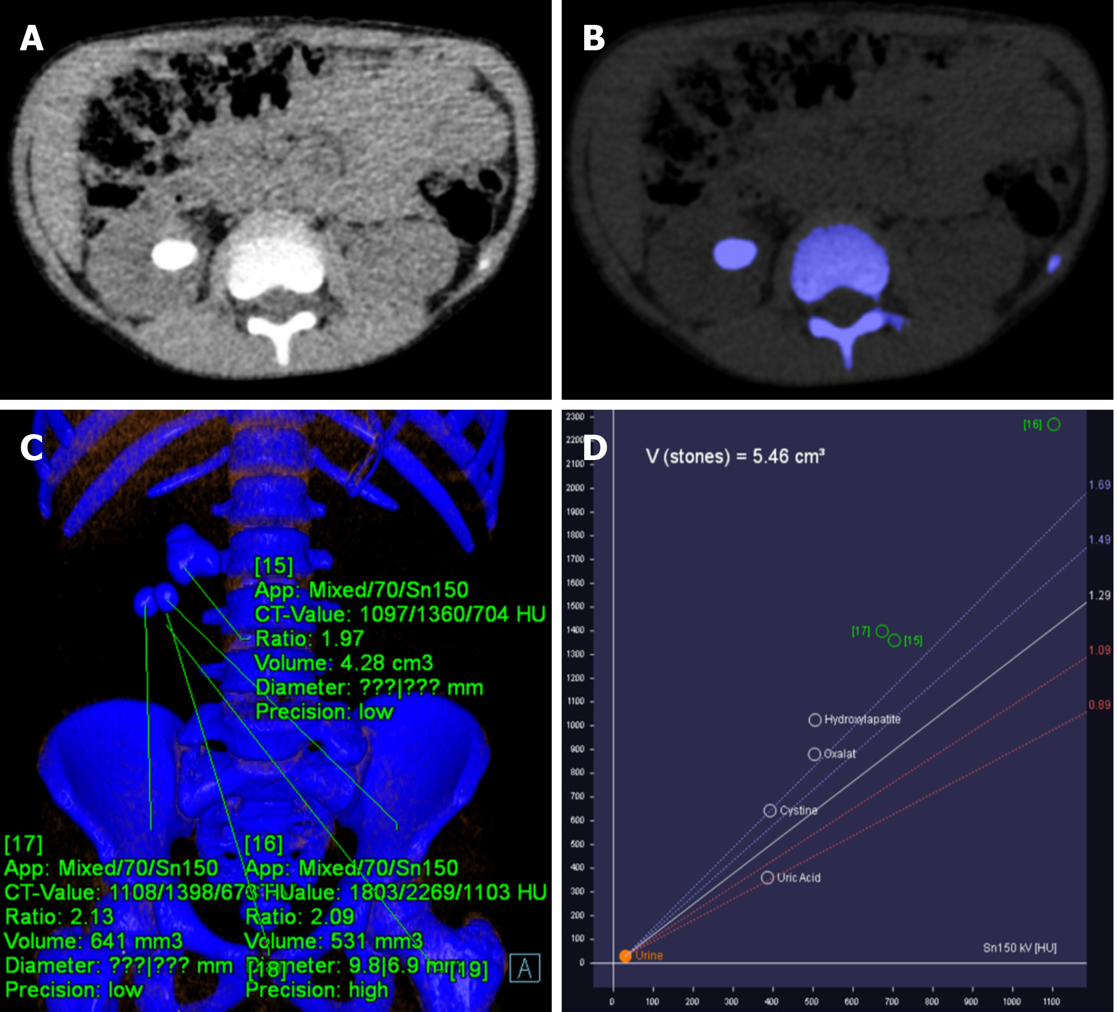 A: Non-contrast CT section of the abdomen showed right renal calculus in the pelvis; B: The calculus was color coded as blue (non-uric acid); C: Attenuation values of calculi on the right side at 70 kV, 150 kV, and blended images; D: The corresponding positions of the attenuation values on the graph indicated non-uric acid composition of the calculi.