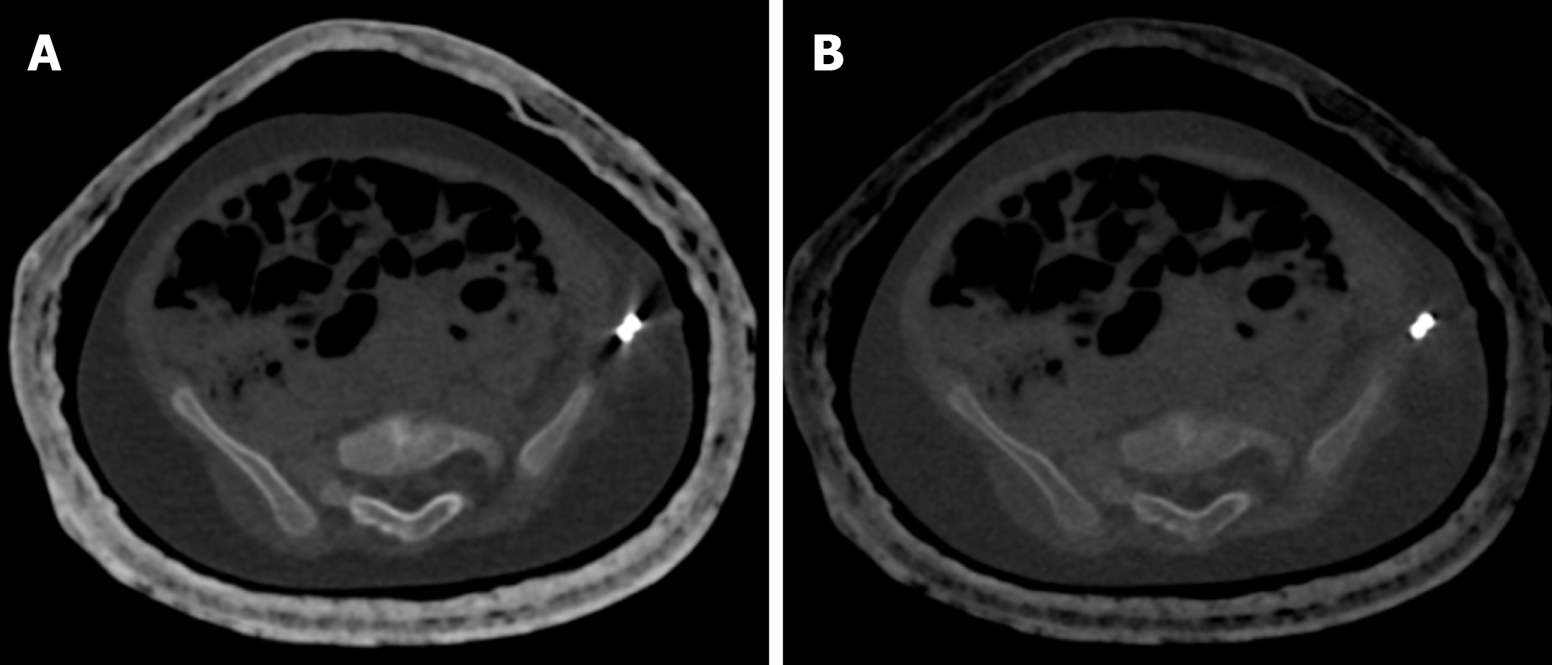 A: Axial bone window image at 70 kV showed marked streak artifacts due to the K-wire inserted along the left iliac bone; B: Axial bone window image at 150 kV showed almost no streak artifacts.
