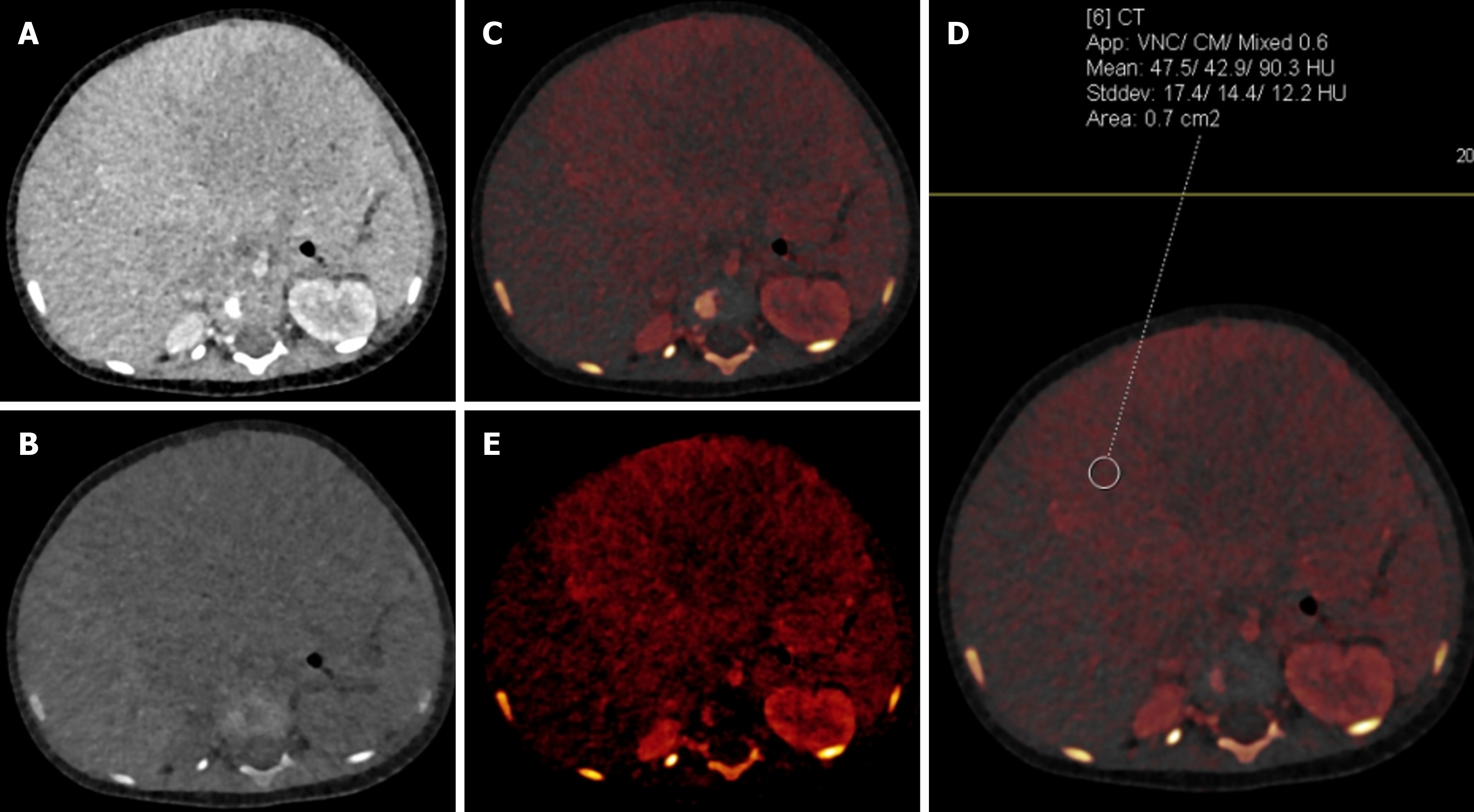 A: Blended contrast-enhanced axial image showed a large isodense mass in the liver with poor demarcation of the mass with the adjacent liver due to minimal enhancement; B: Virtual non-contrast image showed no evidence of calcification/fat/hemorrhage within the lesion; C and D: Iodine overlay images showed iodine uptake in the periphery of the mass with attenuation on the virtual non-contrast image being 475 Hounsfield units and on the blended image being 903 Hounsfield units, suggesting significant enhancement that was not well appreciated on the blended image; E: Iodine-specific image showed the iodine content in the periphery of the mass to a better advantage.