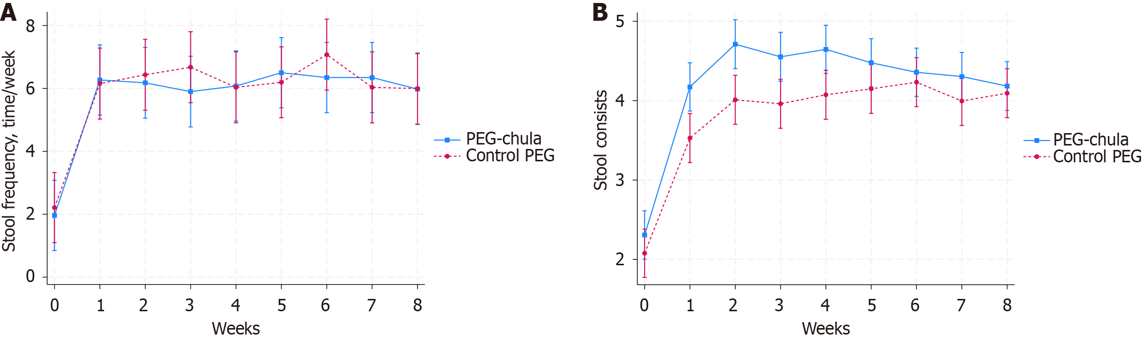 A: Stool frequency; B: Stool consistency. PEG: Polyethylene glycol.