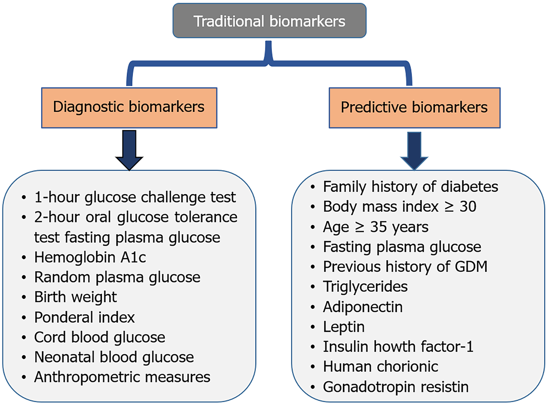 Figure 1 Diagrammatic representation of traditional biomarkers (diagnostic and predictive biomarkers) for gestational diabetes mellitus.