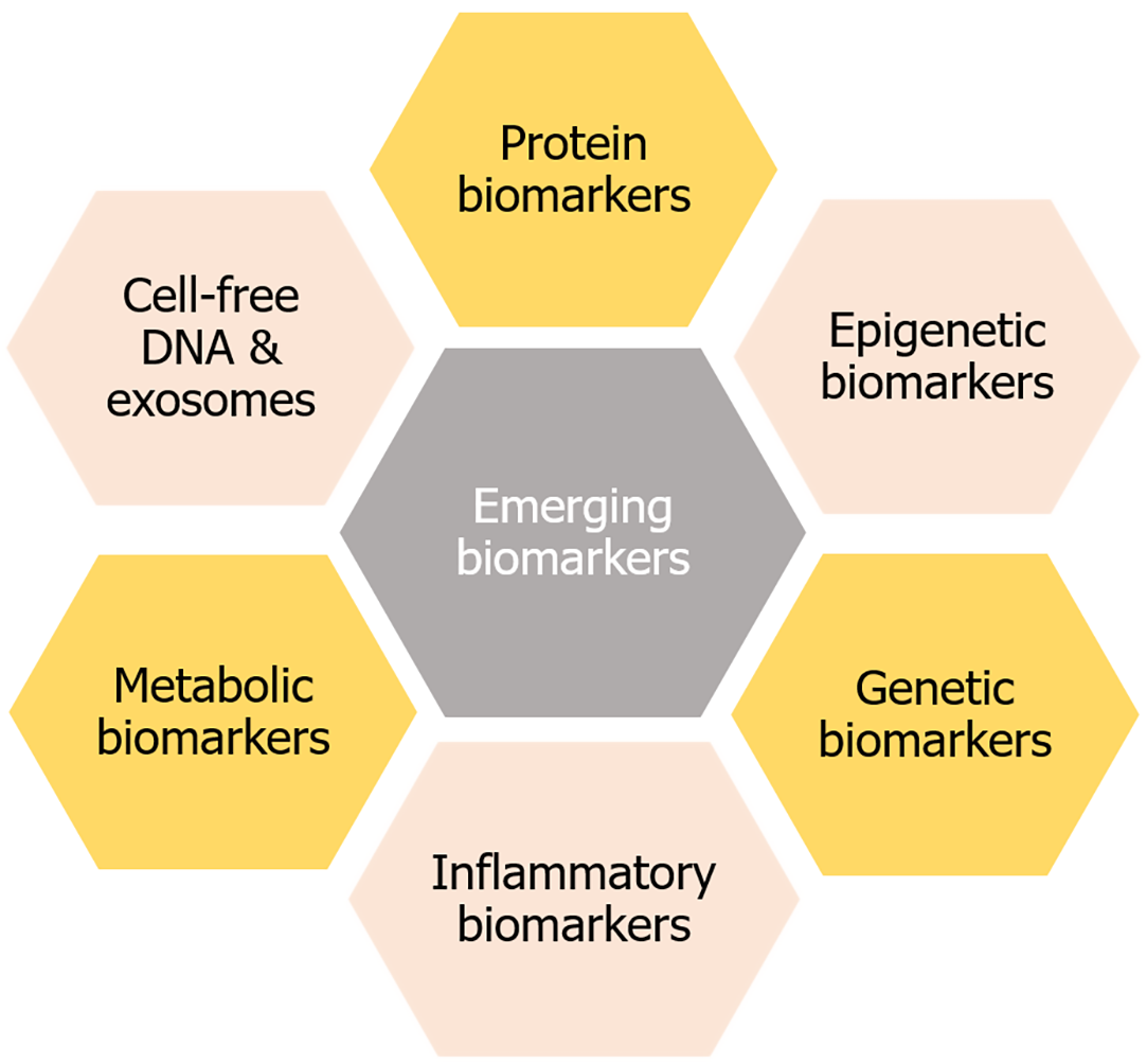 Figure 2 Diagrammatic representation of emerging biomarkers for gestational diabetes mellitus, such as epigenetic biomarker, genetic biomarker, metabolic biomarker, inflammatory biomarker, protein biomarker, cell-free DNA, and exosomes.
