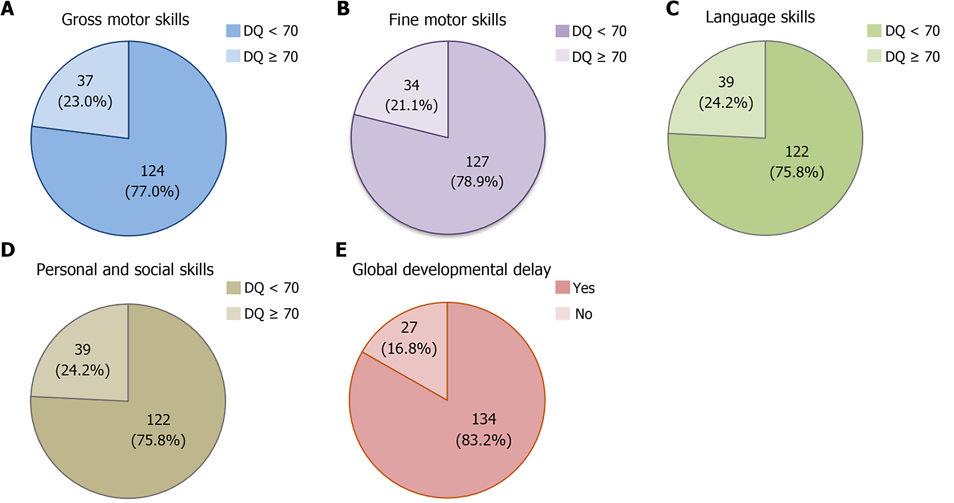 A-D: The majority of pa tients—more than three-quarters—had developmental delays across all domains, with developmental quotient below 70; E: Moreover, most patients (83.2%) were identified as having global developmental delay. DQ: Developmental quotient.