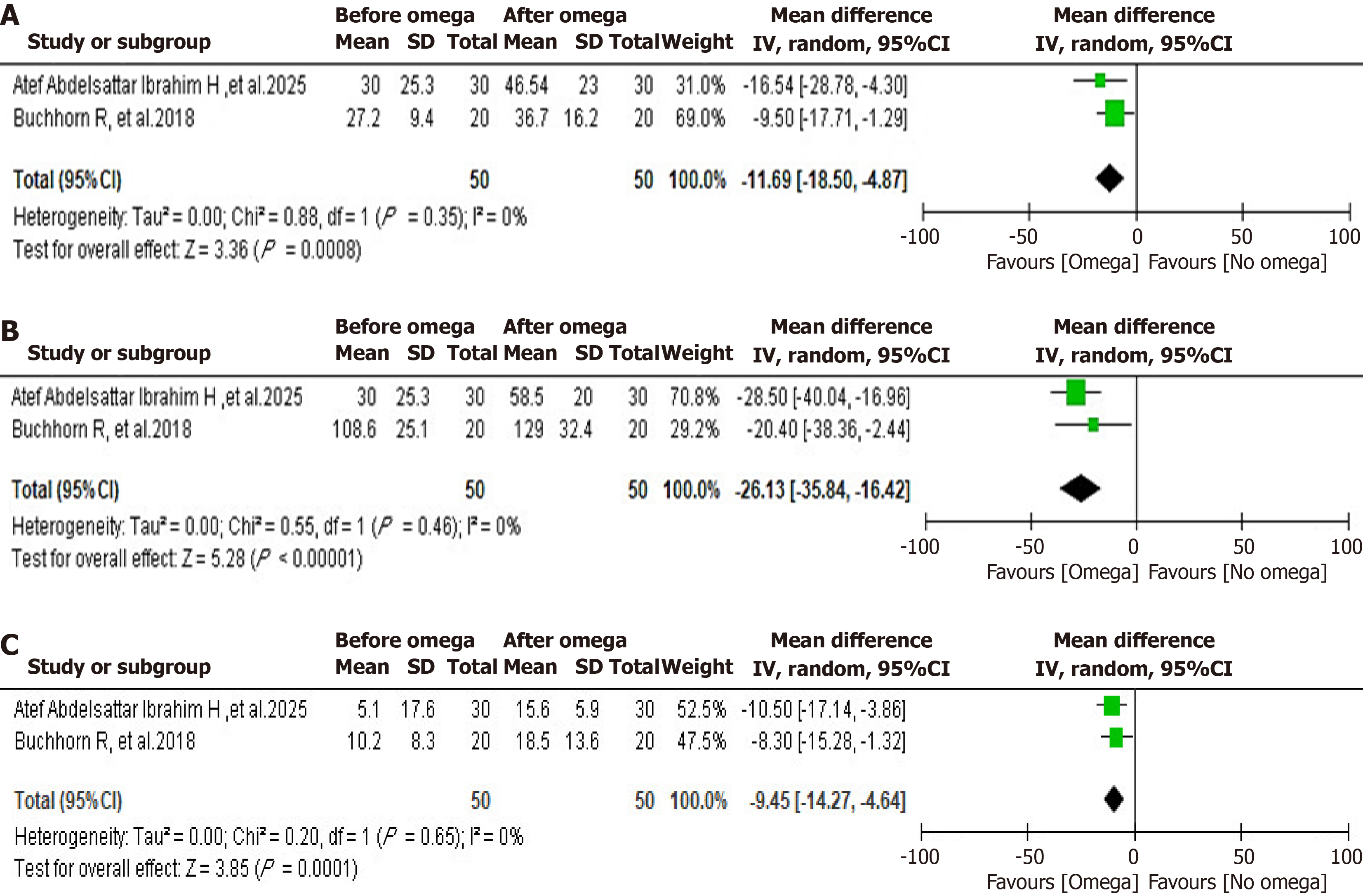 A: Meta-analysis of the root mean square of successive differences (RMSSD) (pre-post). Forest plot of the effect of omega-3 supplementation on RMSSD [time-domain heart-rate variability (HRV) index]. Each square represents the mean difference (MD) with 95%CI; the diamond represents the pooled estimate. The pooled mean difference (MD = -11.69 milliseconds, 95%CI: -18.50 to -4.87, P = 0.0008) indicated a significant improvement with low heterogeneity (I2 = 0%, P = 0.35); B: Meta-analysis of the standard deviation of normal-to-normal intervals (SDNN) (pre-post). Forest plot of the effect of omega-3 supplementation on SDNN (time-domain HRV index). The pooled mean difference (MD = -26.13 milliseconds, 95%CI: -35.84 to -16.42, P < 0.00001) indicated a significant improvement with low heterogeneity (I2 = 0%, P = 0.46); C: Meta-analysis of the percentage of successive normal-to-normal intervals differing by more than 50 milliseconds (pNN50%) (pre-post). Forest plot illustrating the effect of omega-3 supplementation on pNN50, a time-domain HRV index reflecting parasympathetic activity. The pooled mean difference (MD = -9.45; 95%CI: -14.27 to -4.64; P = 0.0001) indicated a significant improvement with no heterogeneity (I2 = 0%, P = 0.65).