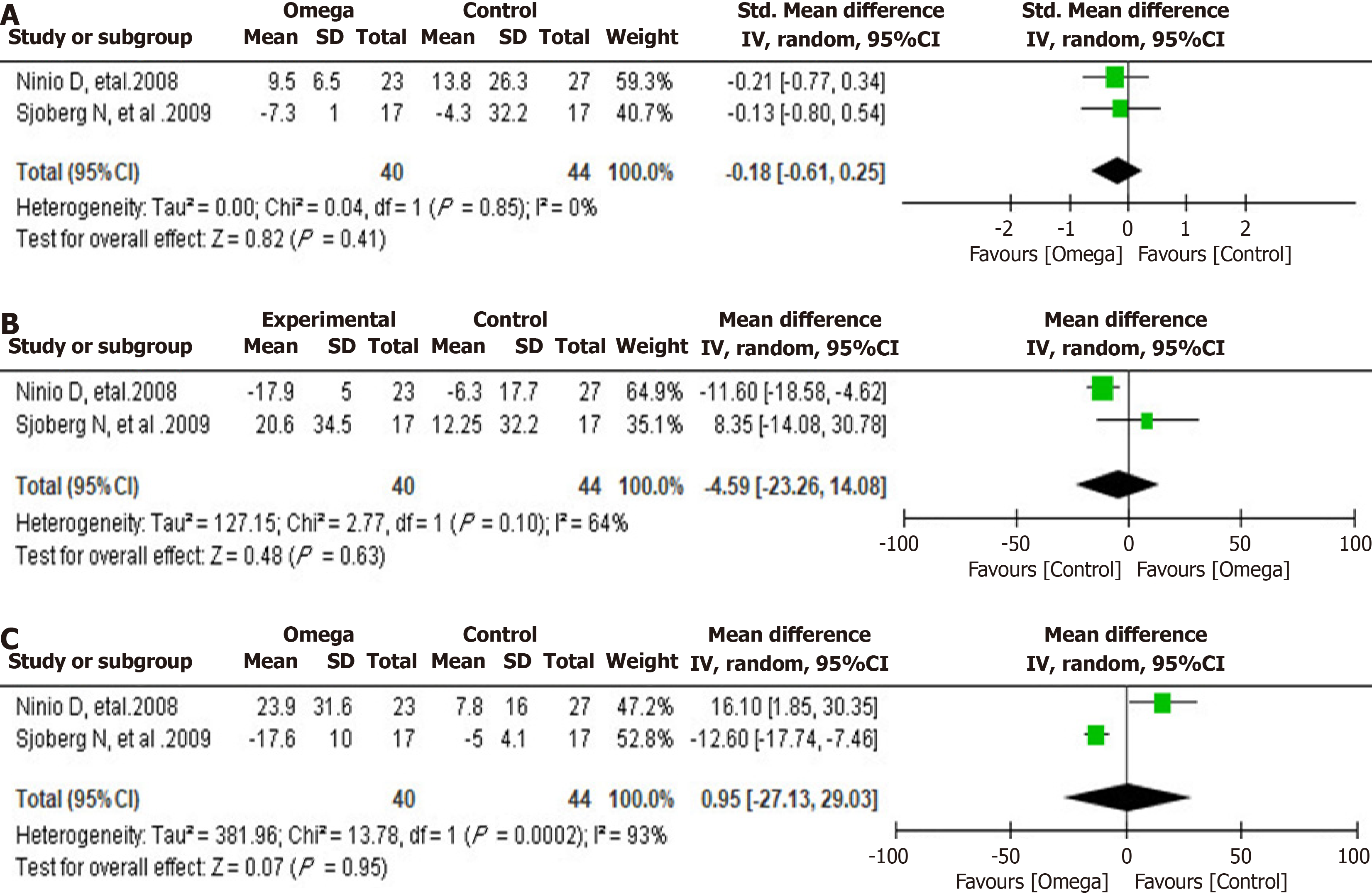 A: Meta-analysis for high-frequency (HF) heart-rate variability. Forest plot showing the effect of omega-3 supplementation on HF power, representing parasympathetic activity. The pooled mean difference [mean difference (MD) = -0.18, 95%CI: -0.61 to 0.25; P = 0.41] indicated no significant change compared with controls. Heterogeneity was minimal (I2 = 0 %, τ2 = 0.00, P = 0.85); B: Meta-analysis for low-frequency (LF) heart-rate variability. Forest plot comparing omega-3 supplementation and control groups for LF power, representing mixed sympathetic and parasympathetic modulation. The pooled mean difference (MD = -4.59 , 95%CI: -23.26 to 14.08; P = 0.63) showed no significant difference. No heterogeneity was observed (I2 = 64 %, τ2 = 127.15, P = 0.10); C: Meta-analysis for low- to high-frequency (LF/HF) ratio heart-rate variability. Forest plot illustrating between-group comparison of the LF/HF ratio following omega-3 supplementation. The pooled mean difference (MD = 0.95, 95%CI: -27.13 to 29.03; P = 0.95) demonstrated no significant change. However, heterogeneity was substantial (I2 = 93%, τ2 = 381.96, χ2 = 13.78, P = 0.0002), reflecting variability among included trials.