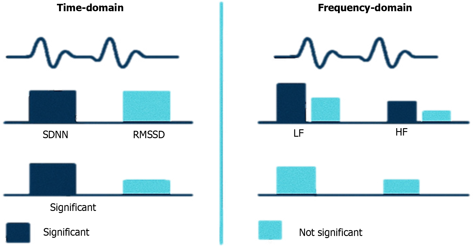 Summary of heart rate variability metric changes following omega-3 supplementation. Significant improvements were observed in time-domain indices (standard deviation of normal-to-normal intervals, root mean square of successive differences), whereas frequency-domain indices (high frequency, low frequency) showed non-significant changes. Dark bars indicate statistically significant outcomes (P < 0.05). HF: High frequency; LF: Low frequency; RMSSD: Root mean square of successive differences; SDNN: Standard deviation of normal-to-normal intervals.