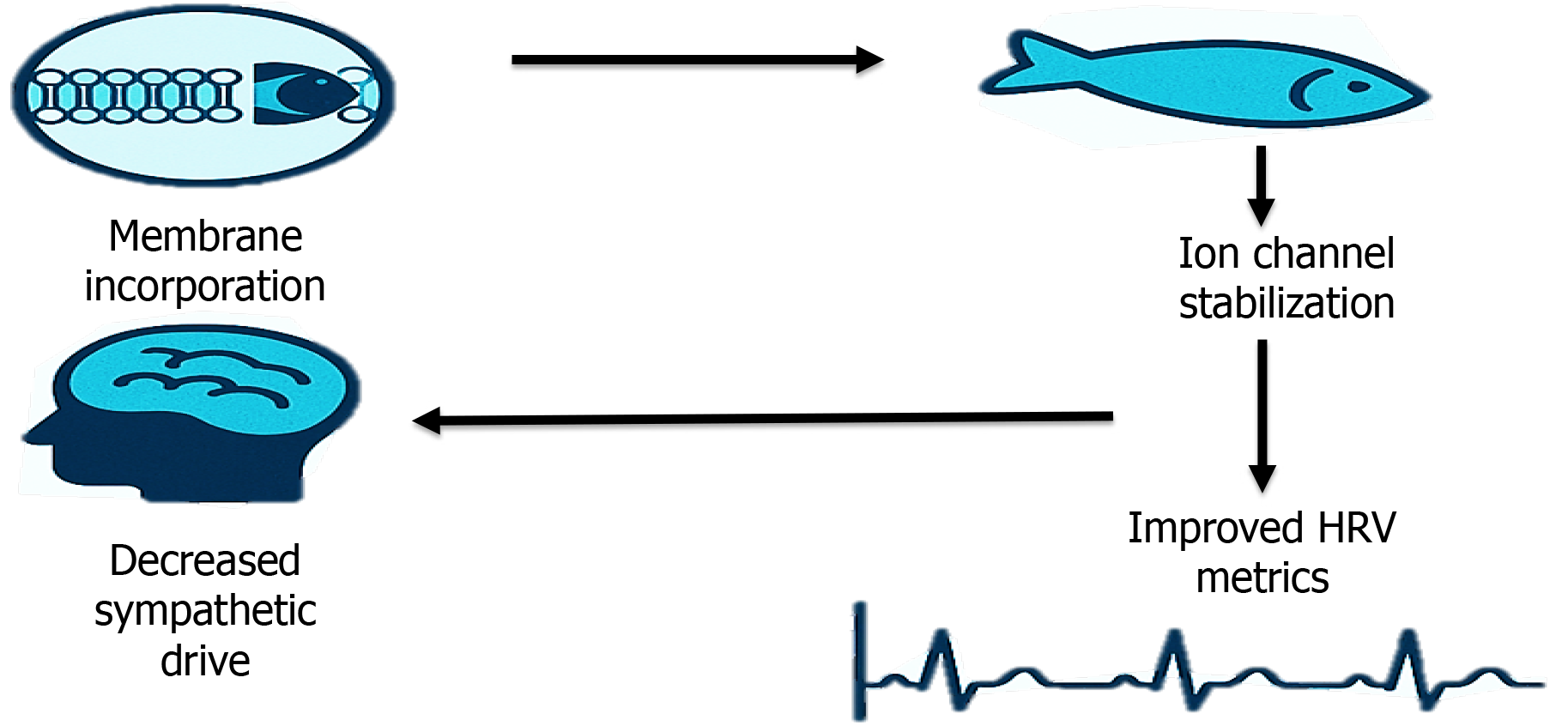Membrane incorporation of eicosapentaenoic acid and docosahexaenoic acid stabilizes ion channels, reduces sympathetic drive, and contributes to improved heart rate variability metrics (standard deviation of normal-to-normal intervals, root mean square of successive differences). HRV: Heart rate variability.