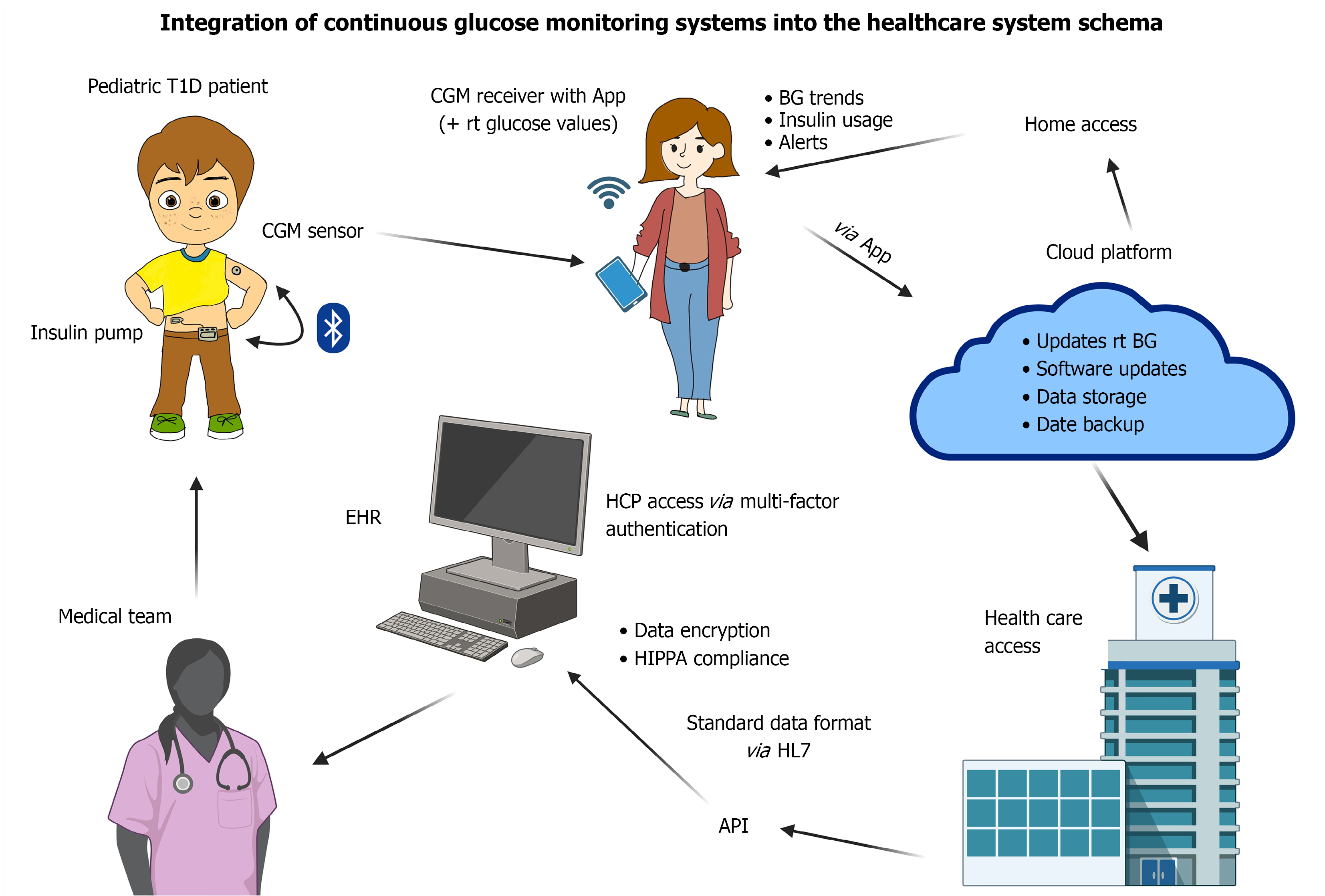 BG: Blood glucose; CGM: Continuous glucose monitor; rt glucose: Real-time glucose; HIPPA: Health Insurance Portability and Accountability Act; EHR: Electronic health record; HCP: Healthcare personnel; HL7: Health level 7; API: Application program interface.