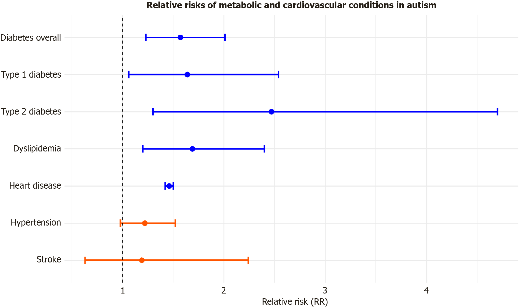 The plot presents pooled relative risk (RRs) from meta-analyses across multiple studies for various conditions: Diabetes overall, type 1 diabetes, type 2 diabetes, dyslipidemia, heart disease, hypertension, and stroke. Blue points indicate significant associations (P < 0.05), where the 95%CI does not cross the line of no effect (RR = 1), suggesting a higher risk of the condition in autistic individuals compared to controls. Red points represent non-significant results (P ≥ 0.05), where the 95%CI crosses the RR = 1 line, indicating no statistically significant difference in risk between autism and controls. The vertical dashed line at RR = 1 serves as a reference, representing no increased or decreased risk. Conditions such as type 2 diabetes and dyslipidemia show a notably higher risk in autism, while the risk differences for hypertension and stroke are not statistically significant.