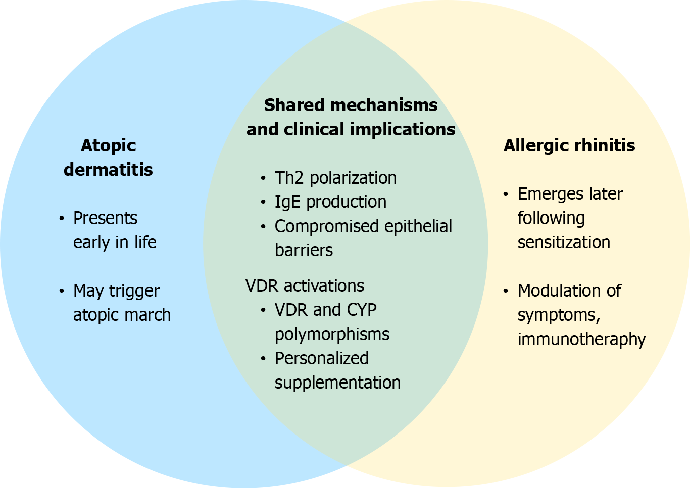 Core Tip: Vitamin D has emerged as a key modulator of immune responses and epithelial barrier integrity relevant to pediatric atopic dermatitis and allergic rhinitis (AR). Recent evidence highlights phenotype-specific effects, particularly in children with allergic sensitization, and suggests stronger associations with seasonal AR. Advances in vitamin D receptor biology and genomics support a personalized approach to supplementation. Early-life vitamin D exposure may influence immune development and disease trajectory, underscoring the potential for preventive and therapeutic applications in pediatric allergy care.