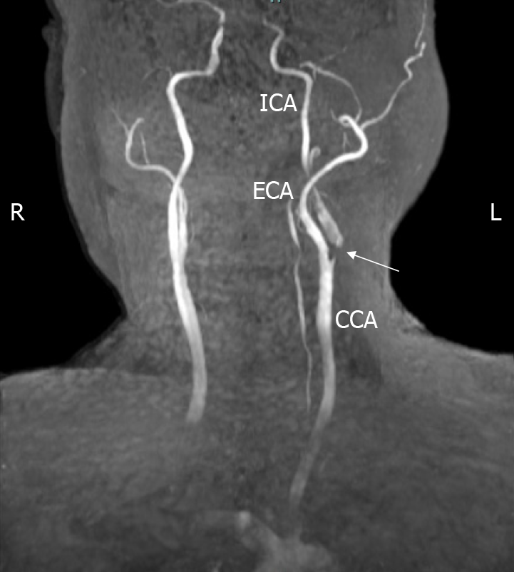 Magnetic resonance angiography showing severe stenosis extending from the left common carotid artery to the bifurcation of the internal carotid artery. CCA: Common carotid artery; ICA: Internal carotid artery; ECA: External carotid artery; R: Right; L: Left.